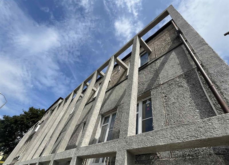 Ze względu na wpis obiektu do Gminnej Ewidencji Zabytków, remont odbywał się pod ścisłym nadzorem Miejskiego Konserwatora Zabytków. Konieczne było rozebranie i ponowne odtworzenie konstrukcji oraz historycznej wyprawy tynkarskiej. Najtrudniejszym etapem było dobranie odpowiedniej konsystencji i składu tynku, by wiernie odtworzyć oryginalny efekt z okresu modernizmu. Prace rozpoczęto od szczegółowych badań laboratoryjnych próbek istniejącej wyprawy. Na tej podstawie określono składniki – w tym tynk mineralny z dodatkiem mini i drobnego szkła – a następnie wykonano serię próbnych mieszanek. Każda z nich była oceniana przez Konserwatora Zabytków, który wskazywał ewentualne korekty. Po zaakceptowaniu ostatecznej wersji przystąpiono do tynkowania ryglowej konstrukcji żelbetowej.