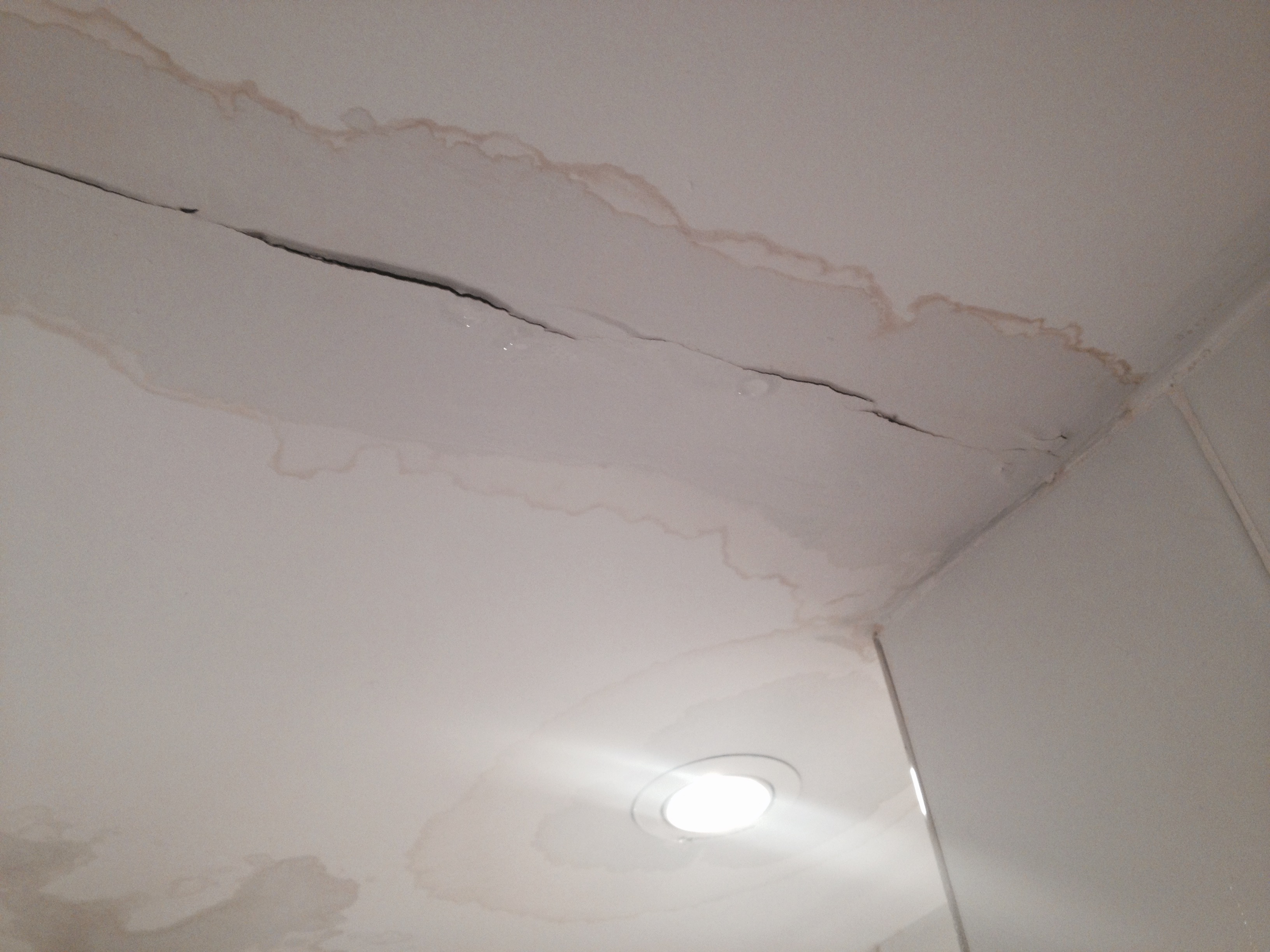 W środę pan Rafał wyjechał. Klucze do mieszkania zostawił sąsiadce. Ta w piątek ok. 15.30 zobaczyła, że z sufitu w łazience znów cieknie woda, również z lamp halogenowych. Po ośmiu zalaniach płyty są popękane, farba już odpada.
