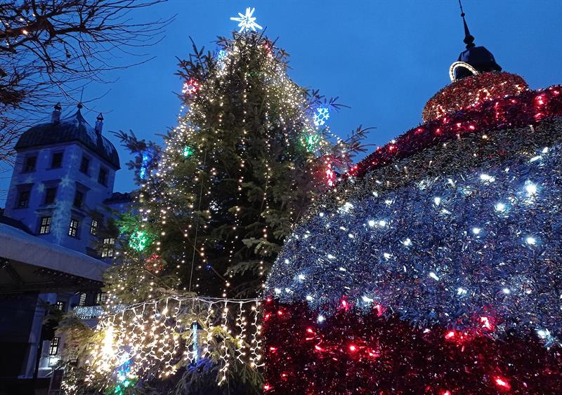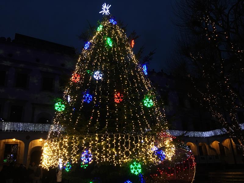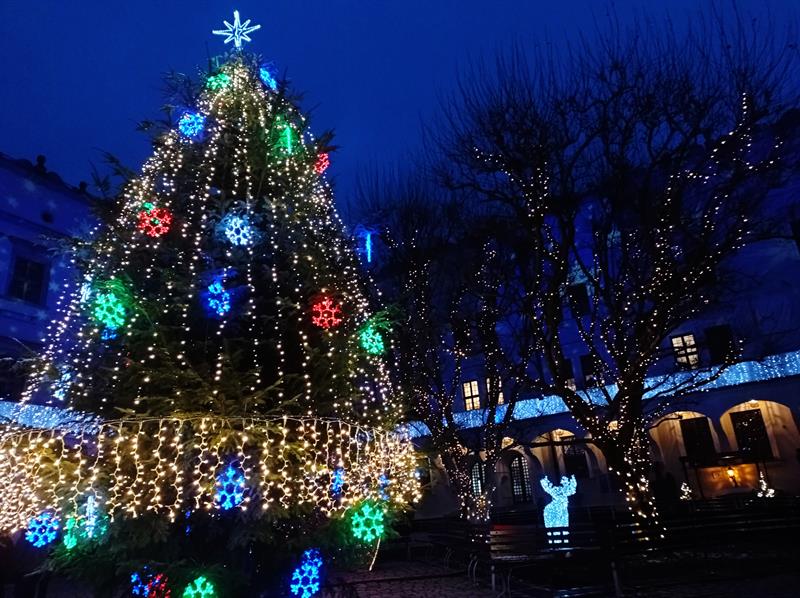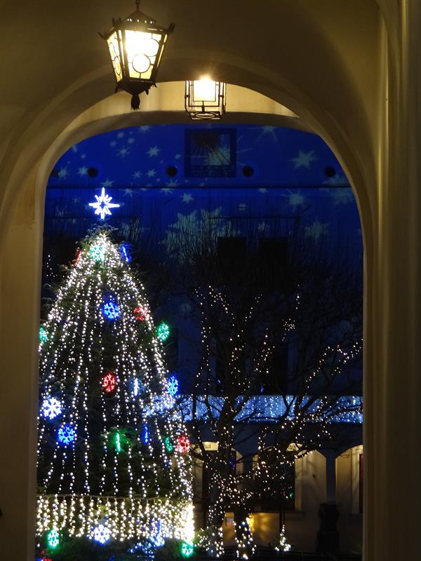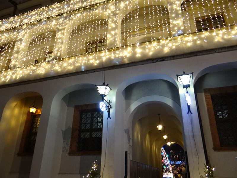Na placu jest też bombka. Ledowymi lampkami oplecione zostały ponadto drzewa rosnące na obu dziedzińcach, małe świerki i balkony budowli. Elewacje gmachu oblewają zaś dobrze już znane z lat poprzednich płatki śniegu, a po wieży dzwonów przemyka zaprzęg św. Mikołaja. Od piątku do niedzieli (10-12 bm.) w tej scenerii odbędzie się 9 edycja kiermaszu bożonarodzeniowego. ©℗