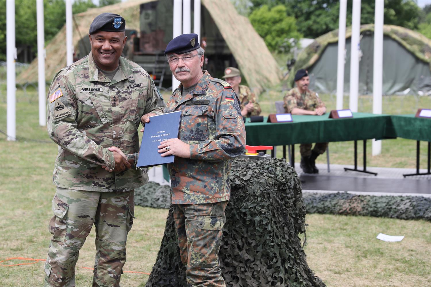 Na zdjęciu:Gen. Darryl A. Williams (z lewej) wręczył gen. Manfredowi Hofmannowi, dowódcy Korpusu, certyfikat Dowództwa Sił Wysokiej Gotowości.