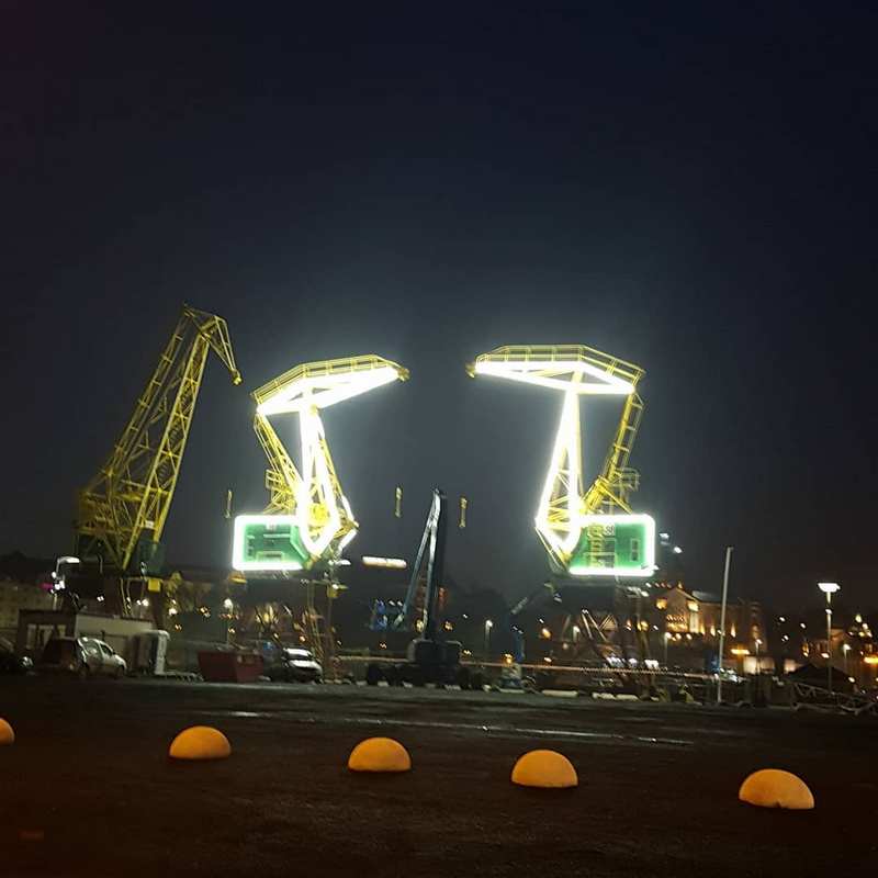 Szczecinianie już od kilku dni podglądali zmieniające się kolory żurawi portowych przy nabrzeżu Starówka. Po próbach nadszedł czas na prezentację stałego już oświetlenia dźwigozaurów.