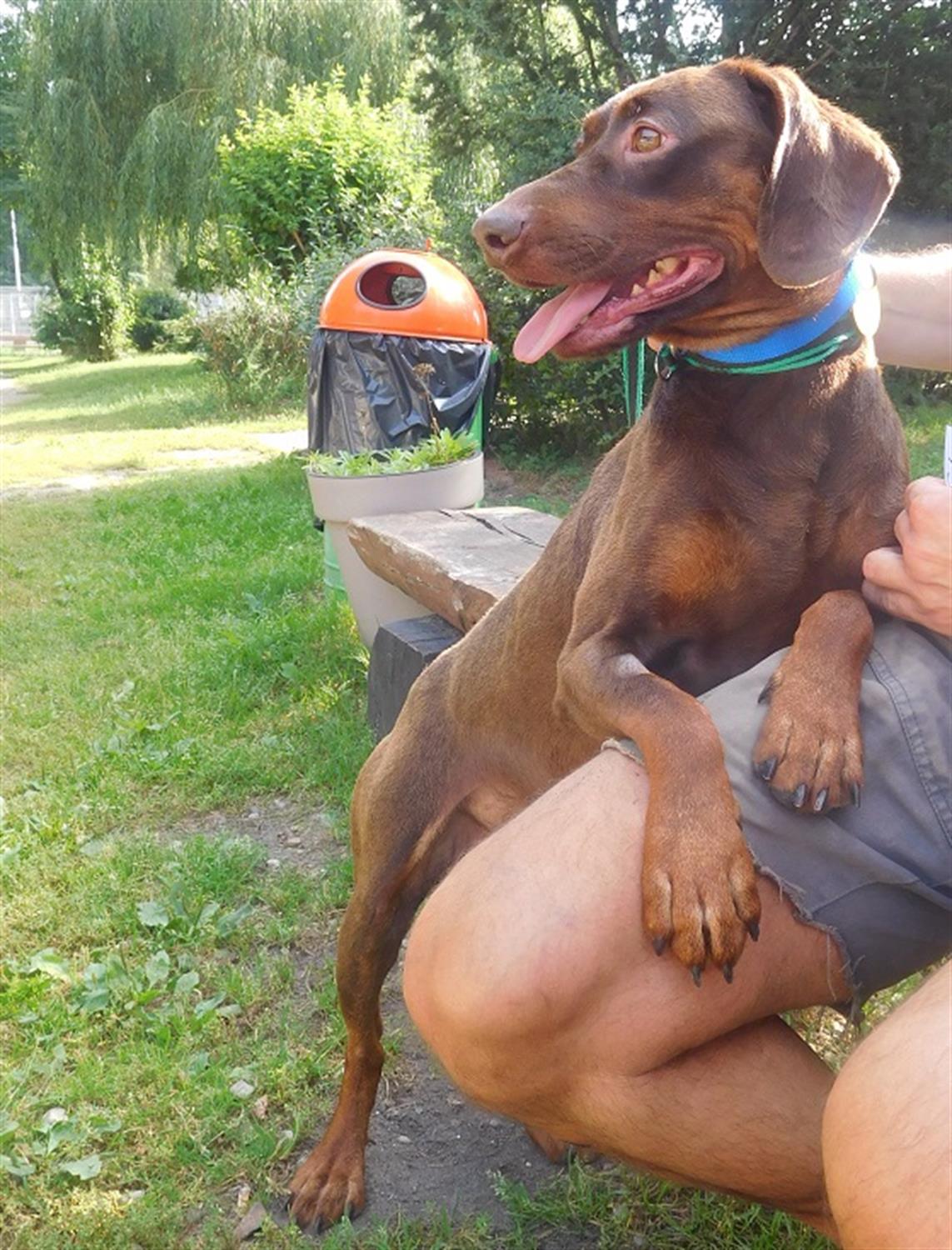 - Trafił do nas nas w połowie wakacji: znaleziony w okolicy Jeziora Głębokie. Nie miał czipa, więc odczekał swoje 14 dni na kwarantannie. A że jest w typie rasy, szybko znalazł nowy dom. Niestety, mimo starań nowych opiekunów nie był w stanie zaakceptować, że nie jest jedynym psem w rodzinie - opowiadają o swym podopiecznym. - Ale poza tym… to niemal chodzący ideał: grzeczny, posłuszny, nauczony czystości, pięknie chodzący na smyczy. Do tego cichy i spokojny. Tyle że ma naturę solisty, więc nie może trafić do domu z innymi psami. Pomimo że na spacerach zwierzęta traktuje przyjaźnie.