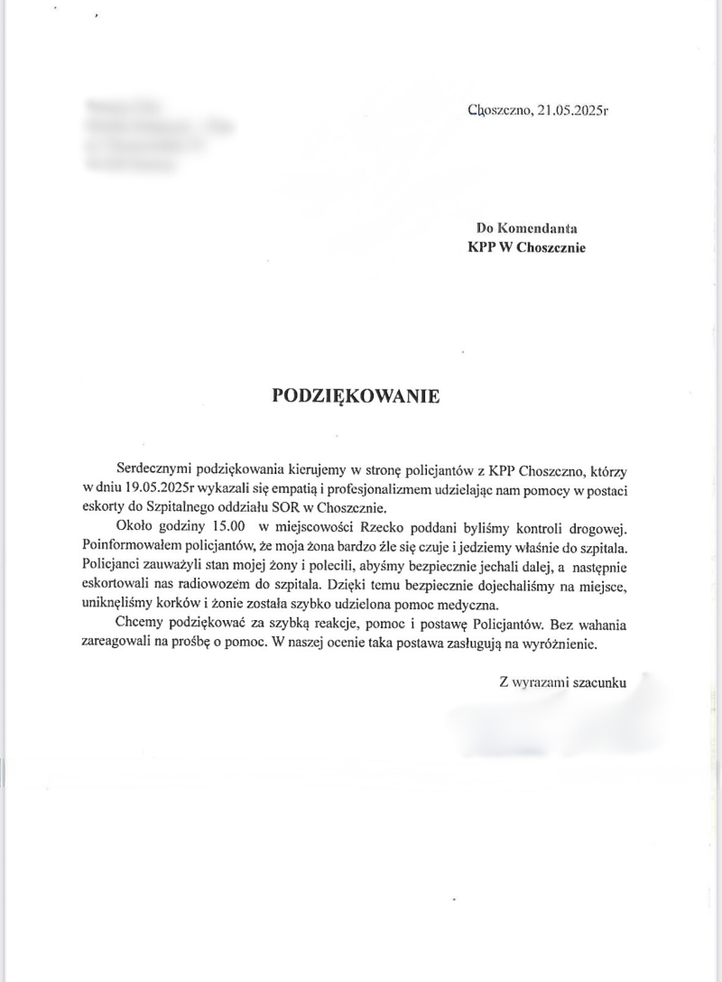 Po zakończeniu tej interwencji do Komendy Powiatowej Policji w Choszcznie wpłynęły podziękowania dla policjantów za pomoc w sytuacji, w której mogło być zagrożone ludzkie życie.