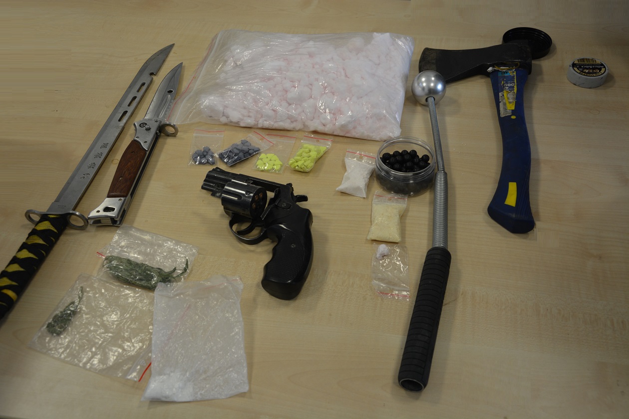 Podczas interwencji funkcjonariusze natrafili u mężczyzny nóż, maczetę, pałkę, ponad 900 g amfetaminy oraz tabletki ekstazy i marihuanę. Jak wyjaśnia oficer prasowy KPP w Stargardzie kom. Łukasz Famulski, do zatrzymania 46-latka doszło przy ul. Bydgoskiej w Stargardzie. Funkcjonariusze użyli przy tym środków pozoracji, dlatego podejrzewany mężczyzna był zupełnie zaskoczony. - Do działań wykorzystano adekwatne siły i środki, gdyż funkcjonariusze wiedzieli, że mężczyzna może być uzbrojony - dodaje kom. Łukasz Famulski. - Poszukiwany był on, aby odbyć dwa lata kary pozbawienia wolności za kierowanie zorganizowaną grupą przestępczą. Najbliższe trzy miesiące mężczyzna spędzi za kratami, a po rozpoznaniu sprawy przez sąd może grozić mu kara nawet 10 lat więzienia.