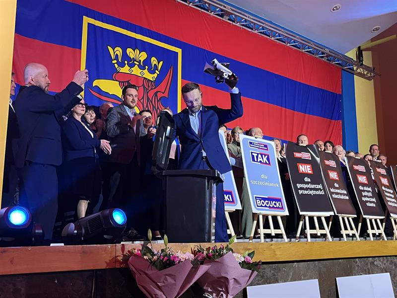 Kandydat PiS i jego sztab zadbali, żeby podczas konwencji wyborczej w budynku Zachodniopomorskiego Uniwersytetu Technologicznego nie zabrakło elementów show. W pewnym momencie centralnym rekwizytem stał się śmietnik, do którego polityk wrzucał kolejne plakaty z "grzechami Piotra Krzystka" zdarte wcześniej z ustawionych na scenie tablic. Towarzyszyły temu entuzjastyczne okrzyki z sali: "Do śmietnika!". Zdzierając materiały z oskarżeniami wobec aktualnego prezydenta Szczecina, poseł odsłaniał swoje, pozytywne hasła.