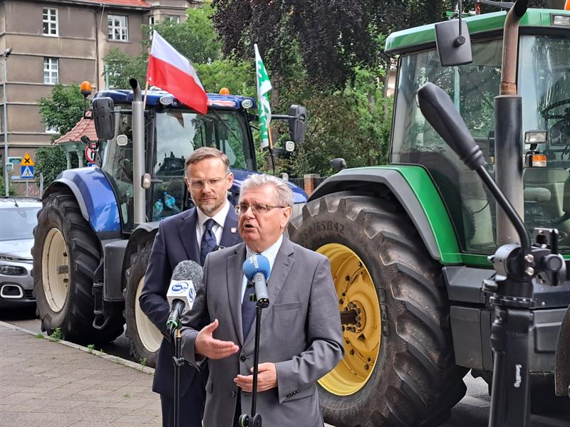 Przed Zachodniopomorskim Urzędem Wojewódzkim w Szczecinie parlamentarzyści Prawa i Sprawiedliwości Zbigniew Bogucki i Czesław Hoc ostro skrytykowali rząd Donalda Tuska za to, że nie broni polskich rolników przed szkodliwymi decyzjami podejmowanymi przez Komisję Europejską i brak reakcji na wykluczenie Polski z negocjacji dotyczących umowy między UE a Ukrainą. Zdaniem posłów PiS sytuacja polskich rolników jest obecnie fatalna, a rzad nie zapewnia Polsce bezpieczeństwa żywnościowego.