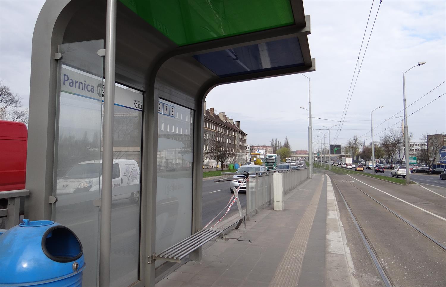 Zdemolowane ogrodzenie i wiata na przystanku Parnica w ul. Gdańskiej po ubiegłotygodniowym wypadku drogowym czekają na remont. Oprócz tego, że samochód, który wjechał w tym miejscu w przystanek, zdewastował ekrany, to jeszcze zdemolował spory fragment samej wiaty.