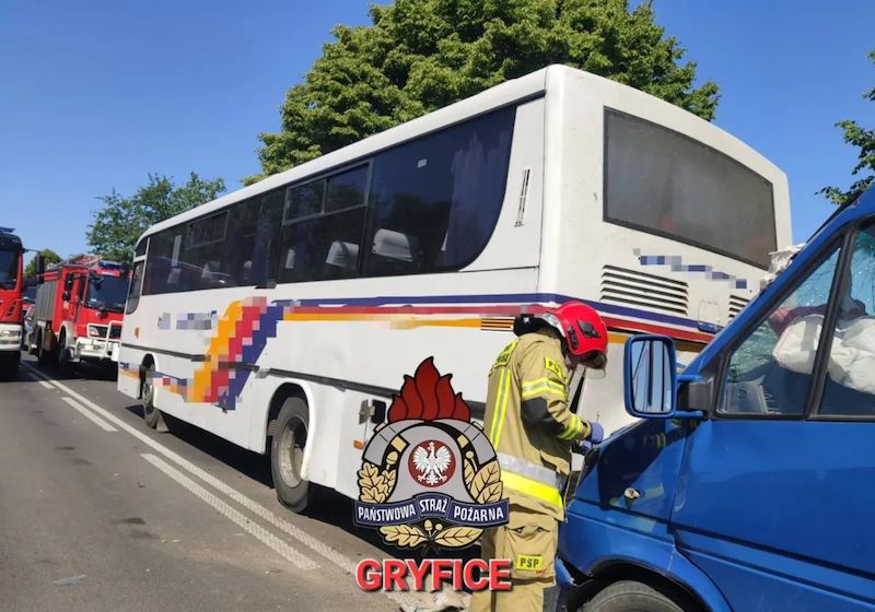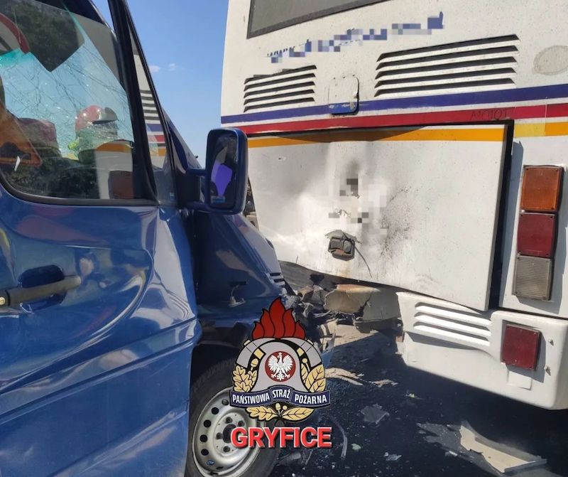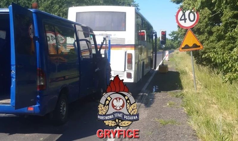 W wypadku obrażenia odniosły trzy osoby jadące busem, który uderzył w tył większego pojazdu.