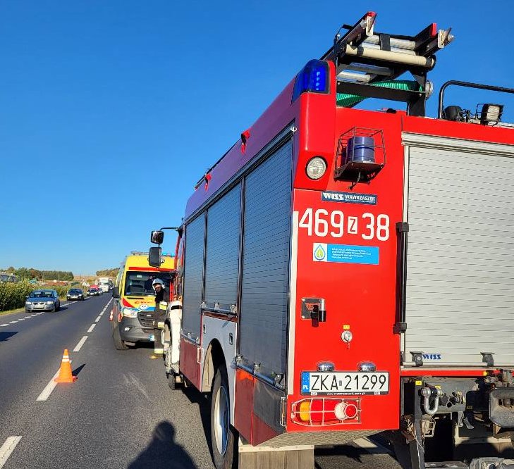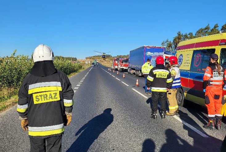 Samochód dostawczy zderzył się tam z ciężarówką. W zgłoszeniu, które dotarło do służb ratowniczych, mowa była o jednej poszkodowanej osobie. Po przybyciu ratowników na miejsce okazało się, że poszkodowane są aż trzy osoby. Stan zdrowia jednego z rannych pogorszył się na tyle, że konieczny okazał się jego szybki transport do szpitala śmigłowcem Lotniczego Pogotowia Ratunkowego.