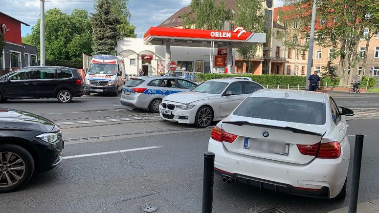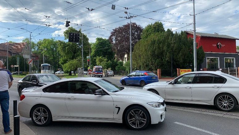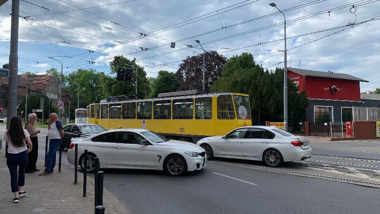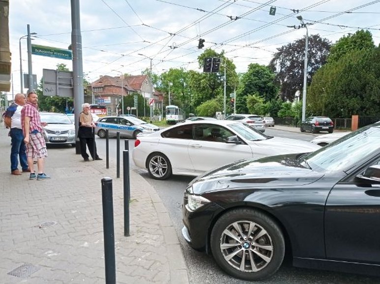 Samochody osobowe marki BMW tarasują częściowo przejazd na skrzyżowaniu al. Bohaterów Warszawy z ulicami Mickiewicza i Wawrzyniaka.