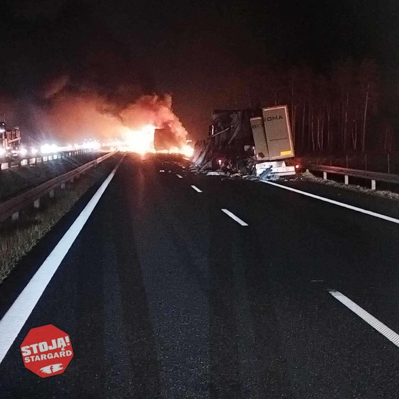 "Na wysokości miejscowości Rurka doszło do pożaru samochodu ciężarowego, zapalił się ciągnik siodłowy wraz z naczepą. Stało się to wskutek prawdopodobnej kolizji z drugim samochodem ciężarowym, który stoi uszkodzony na pasie awaryjnym" – przekazał oficer prasowy Komendy Wojewódzkiej PSP w Szczecinie asp. Dariusz Schacht.