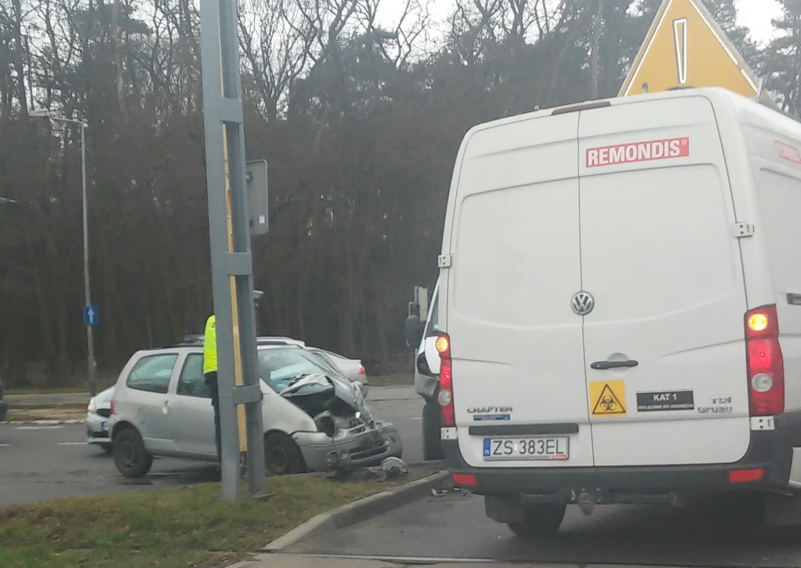 Dwa auta - renault twingo i renault master - zderzyły się na skrzyżowaniu al. Wojska Polskiego z ul. Szafera w Szczecinie.