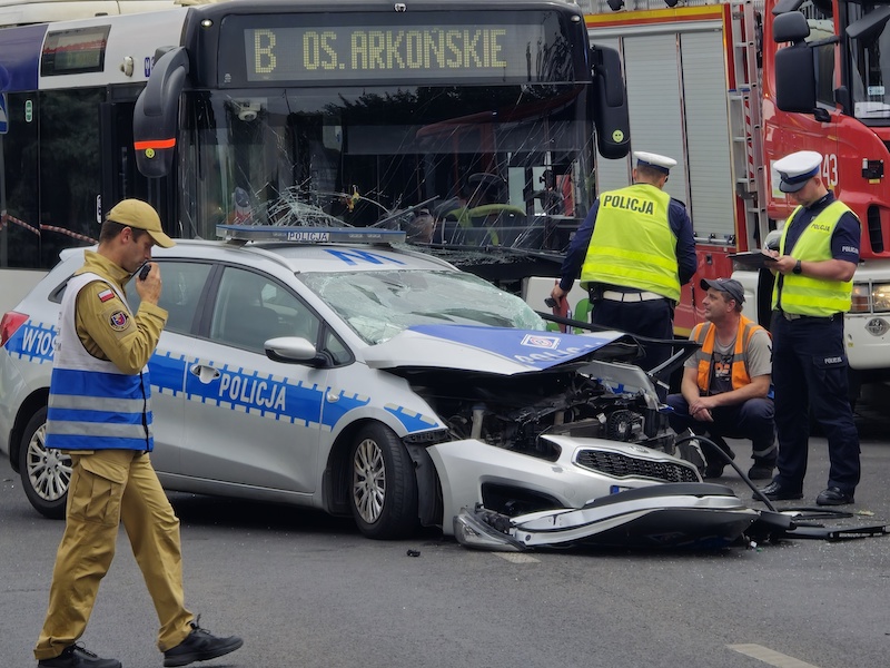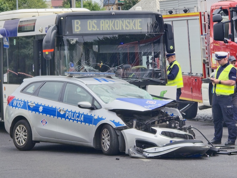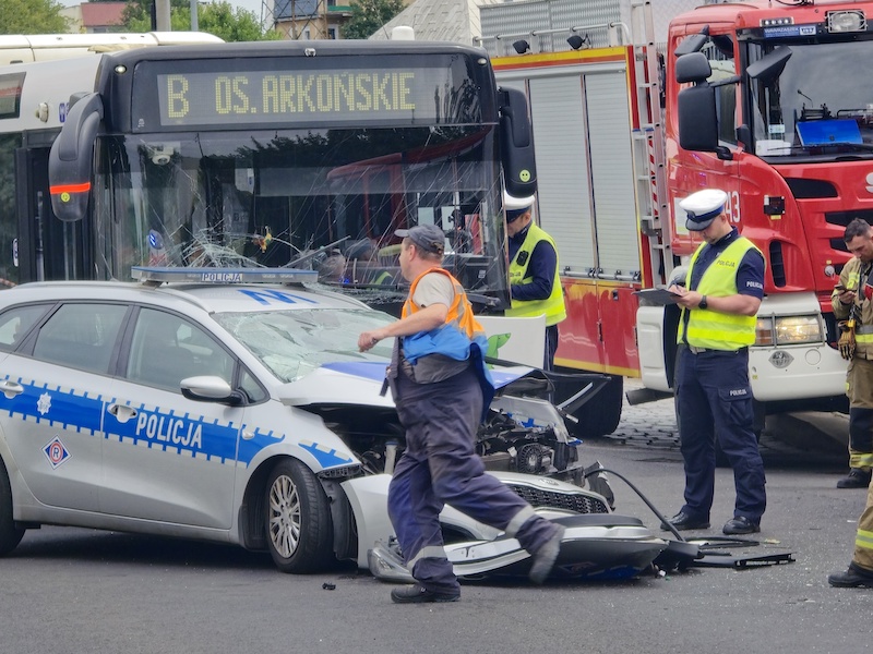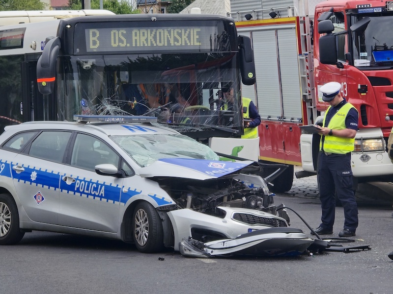 Do wypadku z udziałem jadącego w pościgu radiowozu oraz miejskiego autobusu linii pospiesznej „B" doszło tuż przed godz. 12, w rejonie skrzyżowania ul. Batalionów Chłopskich oraz Winogronowej.