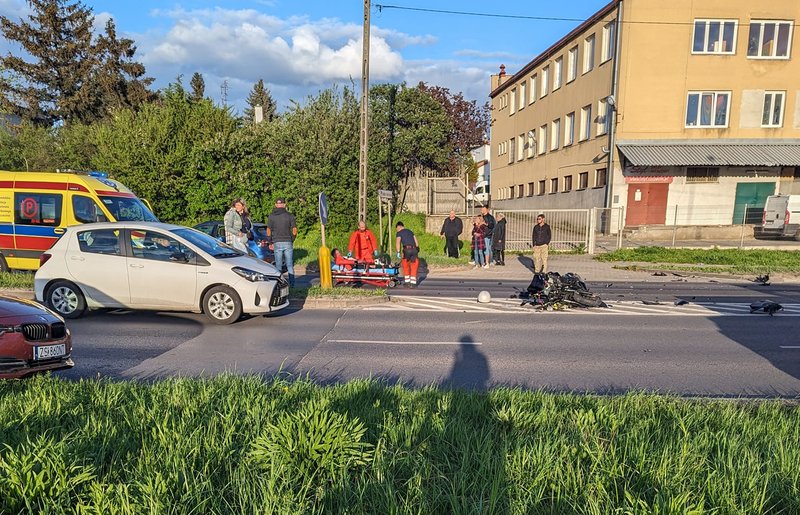 Samochód osobowy zderzył się tam z motocyklem. Obrażeń doznał kierujący jednośladem. Na miejscu pomocy udzielało mu pogotowie ratunkowe. Są utrudnienia w przejeździe.
