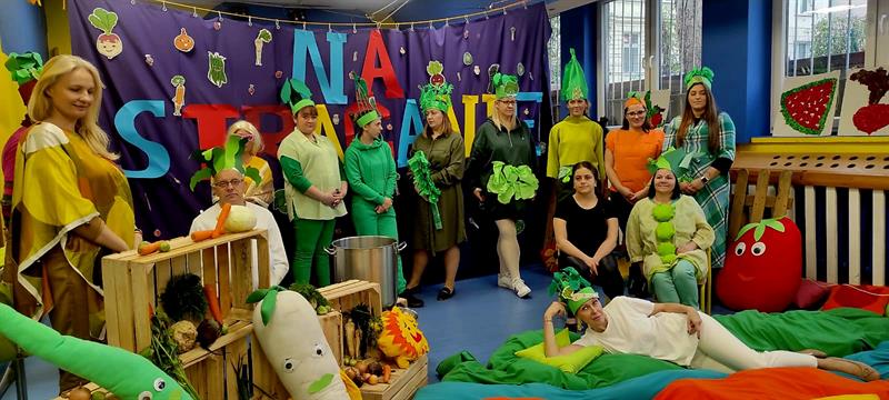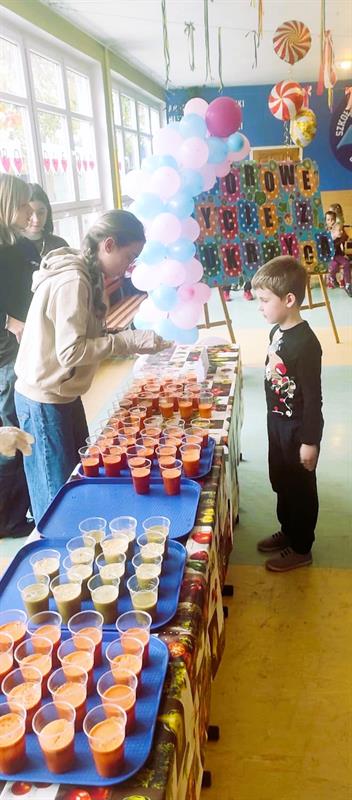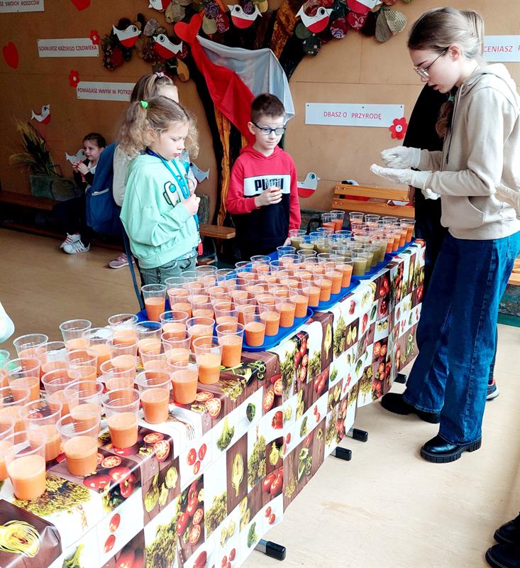 Uczniowie mogli skosztować świeżo wyciskanych soków z warzyw i owoców. Każda klasa z oddziałów I–III wykonywała dowolną techniką na dużym kartonie wylosowany owoc lub warzywo. Dzieci miały za zadanie ubrać się w barwy wylosowanego produktu, gdyż mogły wykonać zdjęcie na specjalnie przygotowanej ściance.