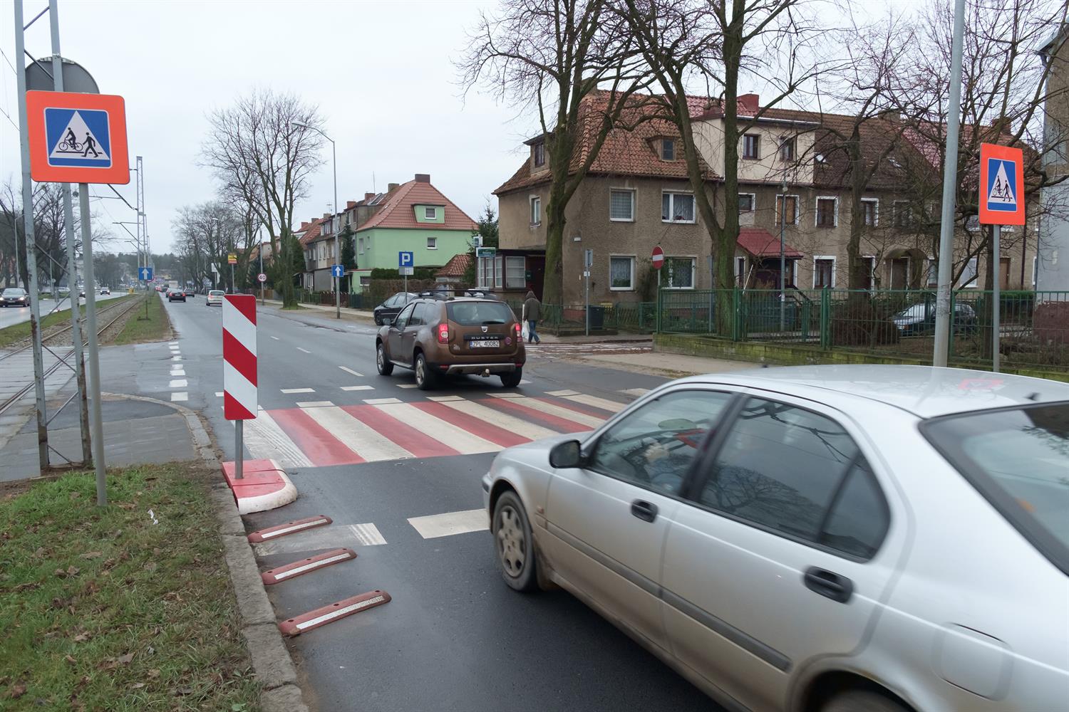 Pod koniec ubiegłego tygodnia na obu nitkach ul. Ku Słońcu w Szczecinie, przed skrzyżowaniem z ulicami Różaną i Źródlaną, zamontowano nowe znaki informujące kierowców o przejściu dla pieszych. Dla bezpieczeństwa tych ostatnich przed zebrami ustawiono również spowalniacze i biało-czerwone elementy bezpieczeństwa ruchu.