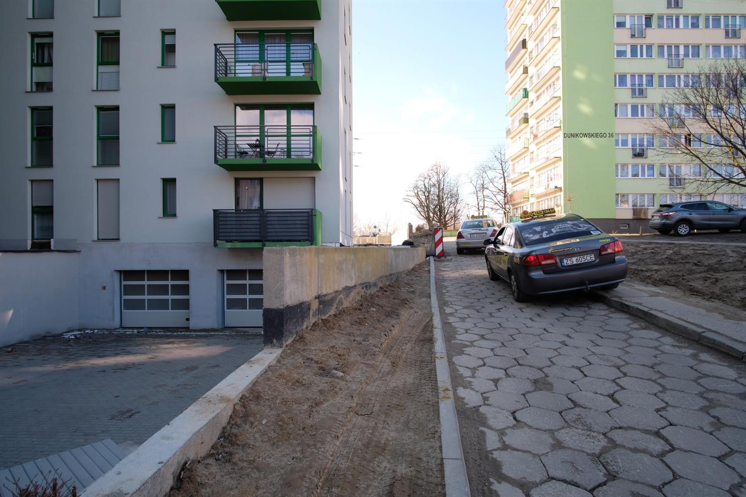 Ul. Dunikowskiego tworzy ogromny trójkąt z jednym krótkim bokiem przy ul. Milczańskiej i dwoma długimi łączącymi się ze sobą w pobliżu (dla uproszczenia) biblioteki PUM – nie licząc kilku mniejszych drogowych odnóg. Wyrosłe w tym kwartale osiedle jest dość duże. Aby dojechać do konkretnego wieżowca – niestojącego bezpośrednio przy ulicy – trzeba wjechać w któryś z łączników. Jeden z nich częściowo zajął developer, który postawił w pobliżu trzy budynki: 38A, B i C.