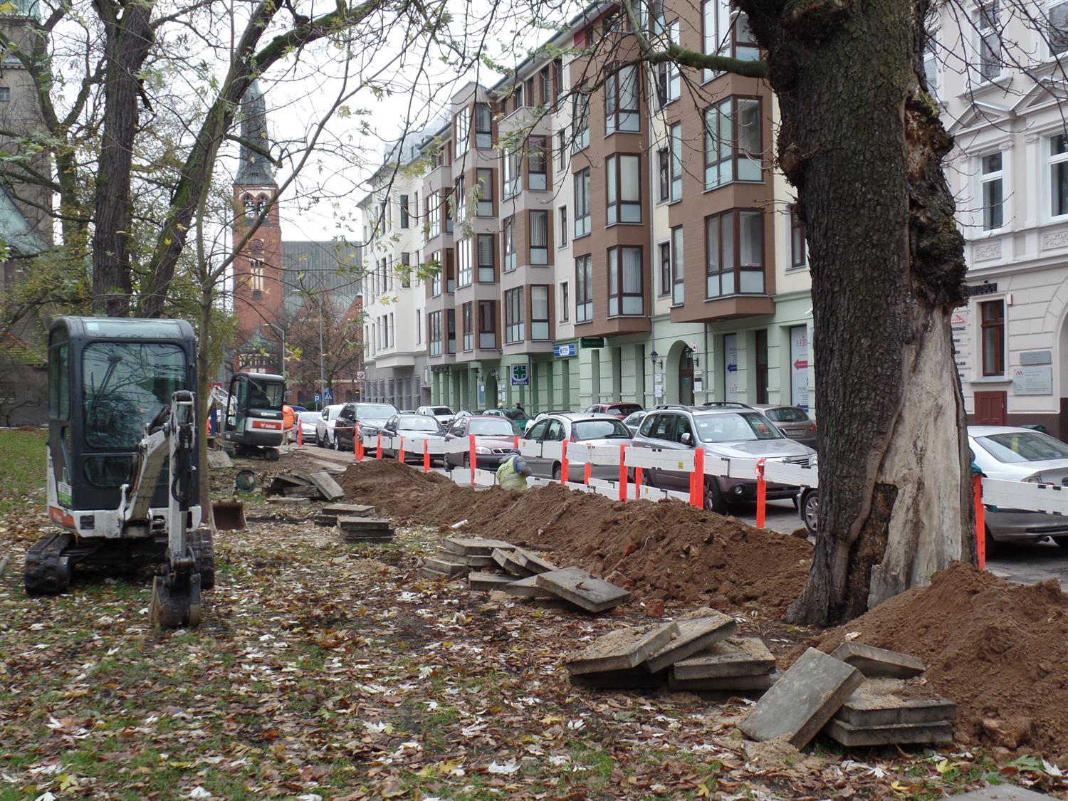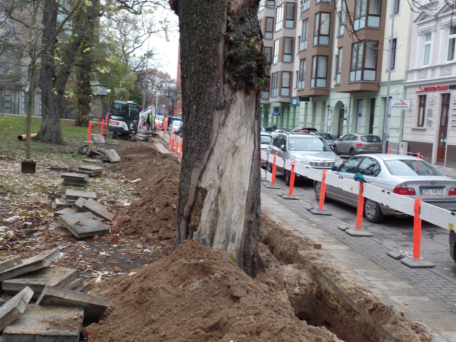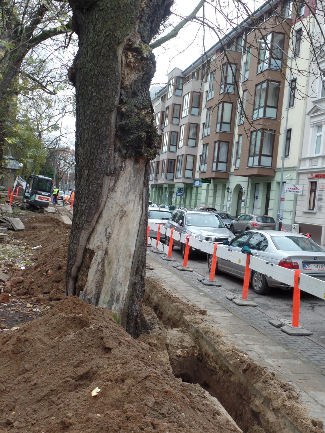 Wykop głęboki na metr wykonany tuż przy wiekowych drzewach. Ich pni nie zabezpieczono, a korzenie podcięto koparką, by nie przeszkadzały w ułożeniu nowej sieci. Cóż z tego, że po takiej - niezgodnej ze sztuką ogrodniczą - ingerencji statyka drzew została naruszona, a one same okaleczone?