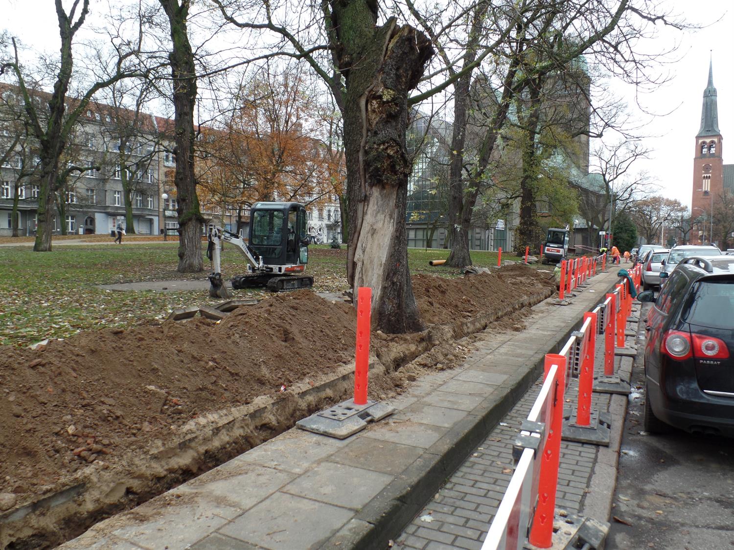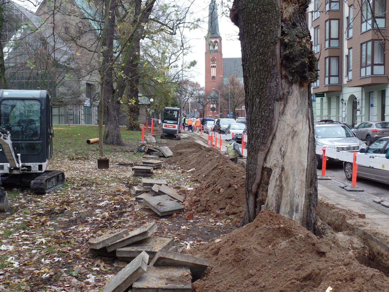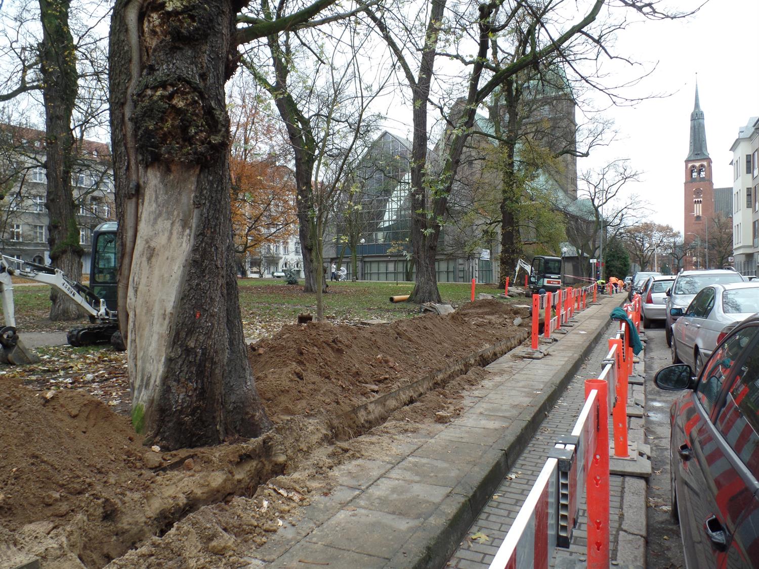 Wykop głęboki na metr wykonany tuż przy wiekowych drzewach. Ich pni nie zabezpieczono, a korzenie podcięto koparką, by nie przeszkadzały w ułożeniu nowej sieci. Cóż z tego, że po takiej - niezgodnej ze sztuką ogrodniczą - ingerencji statyka drzew została naruszona, a one same okaleczone?