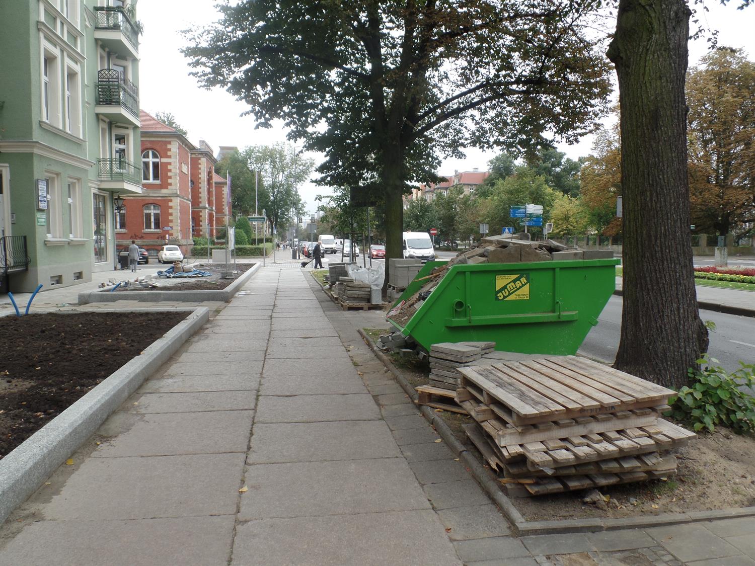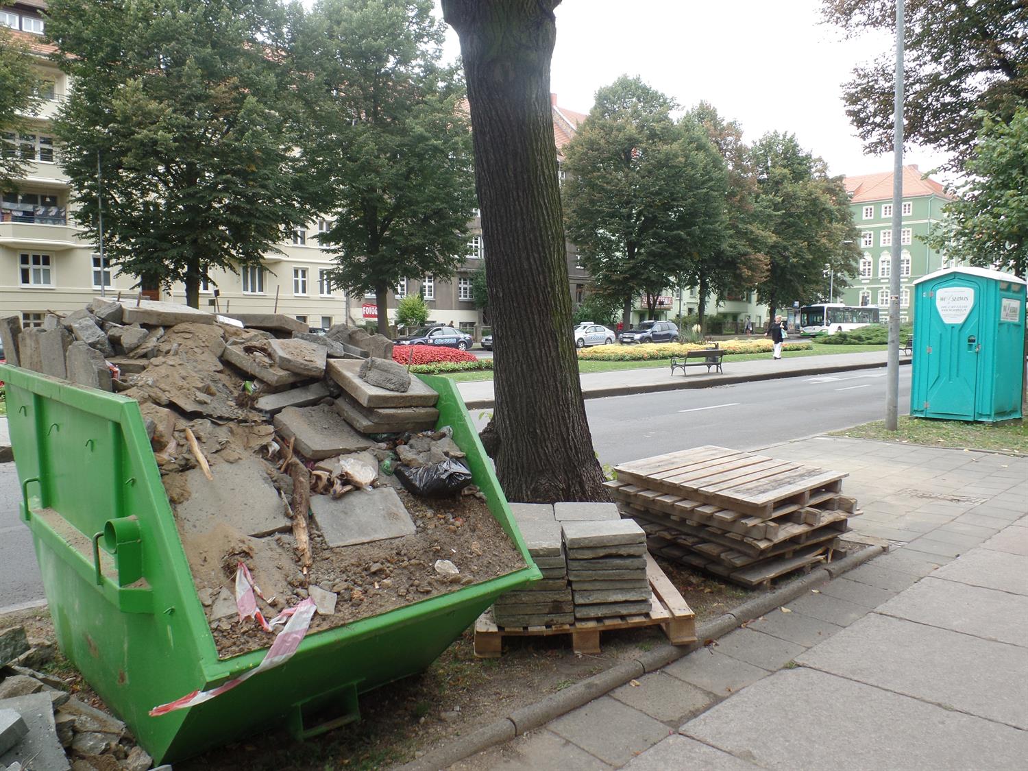 Chodzi nie tylko o materiały budowlane, przenośną toaletę, ale nawet kontener z gruzem i innymi odpadami składowane w bezpośredniej bliskości drzew. Nie dość, że powodują ogromny ucisk, niszczący dla systemów korzeniowych drzew i tak osłabionych, bo rosnących tuż przy jezdni. To jeszcze składowane są na trawniku i przy nieosłoniętych pniach wiekowych lip.