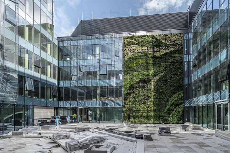 Zielona ściana wyposażona jest w automatyczny system nawadniania. Do podlewania roślin wykorzystywana będzie woda deszczowa magazynowana na bieżąco w specjalnym zbiorniku retencyjnym.