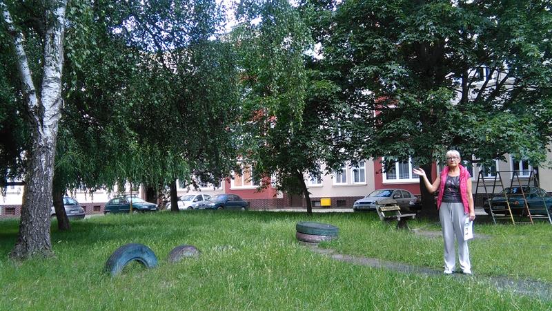 Na zdjęciu: Wszystkie te drzewa, które pokazuje Beata Jasko, miały zostać wycięte z terenu Wspólnoty Mieszkaniowej przy ul. Montwiłła 2-11. W sumie – 15 drzew – jak precyzuje Zarząd Budynków i Lokali Komunalnych. Wszystko to pod szyldem miejskiego programu „Zielone podwórka Szczecina”.
