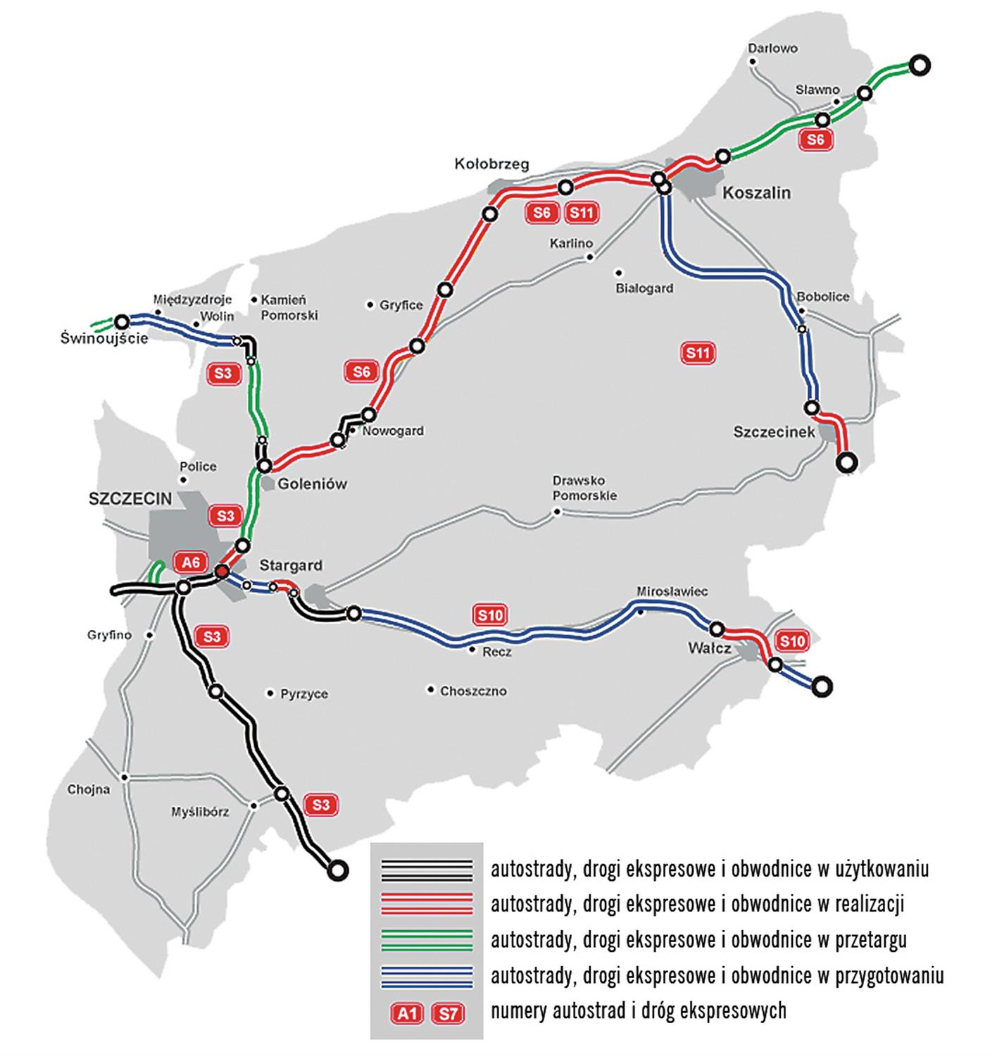 Druga jezdnia obwodnicy S-10 od Kobylanki do Stargardu - stoi, Przeprawa do Świnoujścia - stoi, Zachodnie Obejście Szczecina - stoi, obwodnica Przecławia i Warzymic na DK13 - stoi