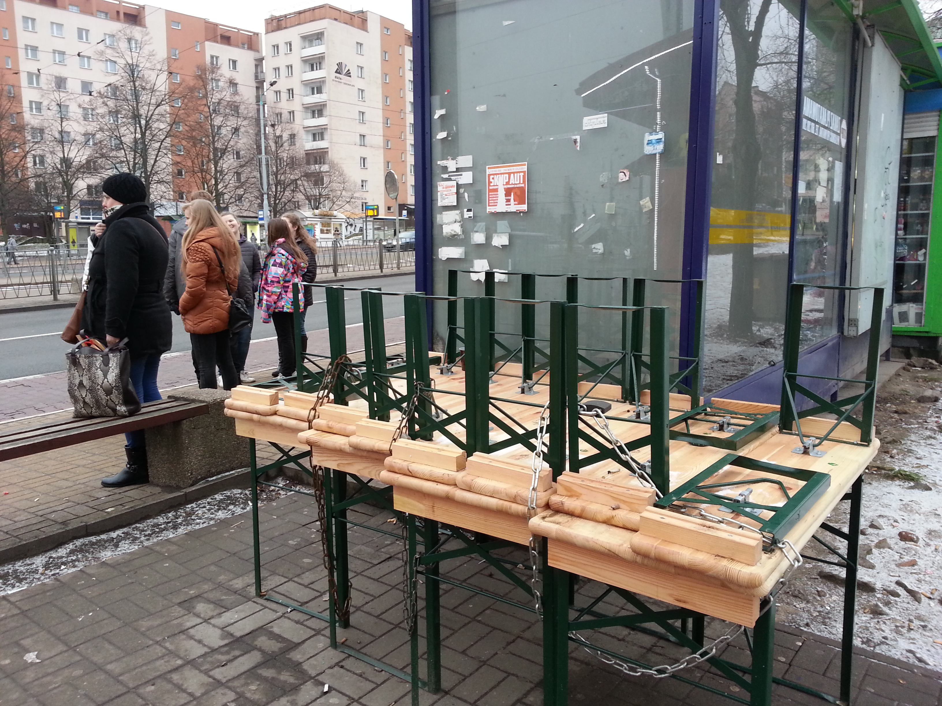 Na taką zimową posezonową wystawkę natkniemy się przy ul. Wyszyńskiego w Szczecinie. Biesiadne stoły i ławy spięte łańcuchami jako swoista instalacja w krajobrazie miejskim między wiatą przystankową i stojącą nieopodal budką fast fooda z kebabami. ©℗