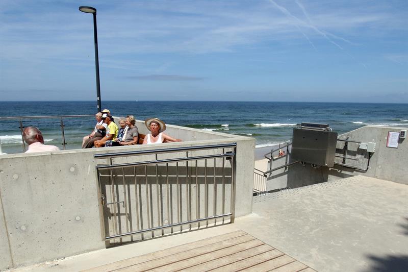 Przy nowym zejściu na kołobrzeską plażę zachodnią uruchomiono platformę dla osób poruszających się na wózkach inwalidzkich. Dzięki temu mogą one zjechać z górnego tarasu widokowego wprost na nią.