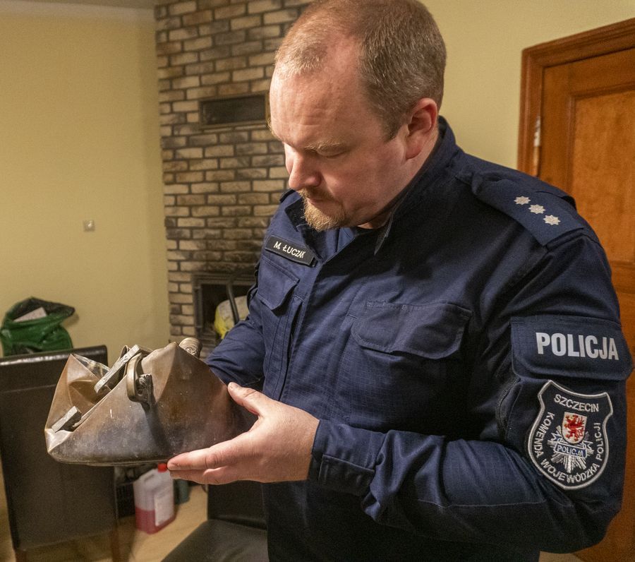 Na zdjęciu: Kom. dr Marek Łuczak ogląda odnaleziony secesyjny kociołek z mosiądzu, zaginiony z kościoła w Skolwinie po 1998 roku.