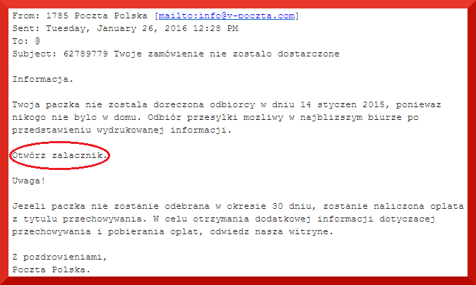 Na zdj.: Tak wygląda przykładowy, fałszywy mail, rzekomo wysłany przez Pocztę Polską.