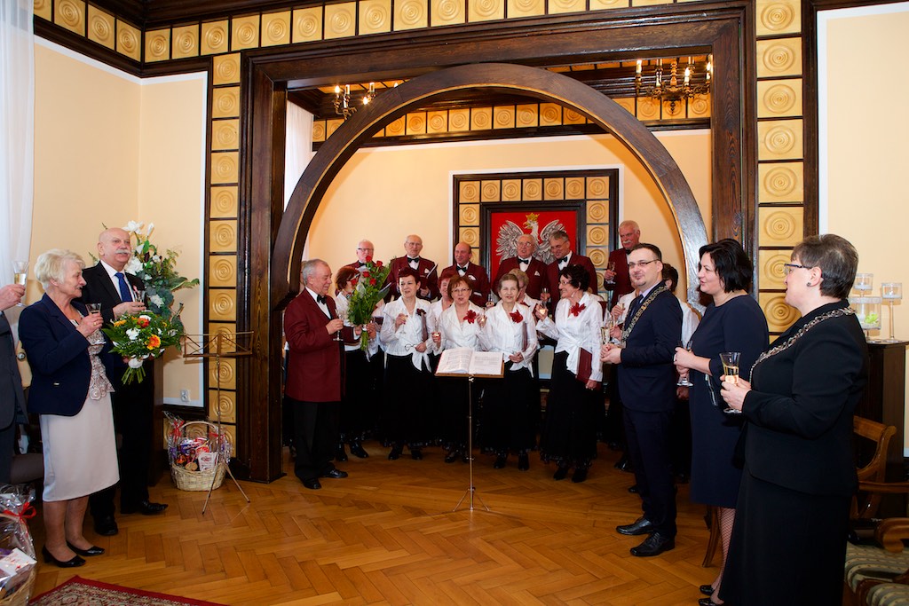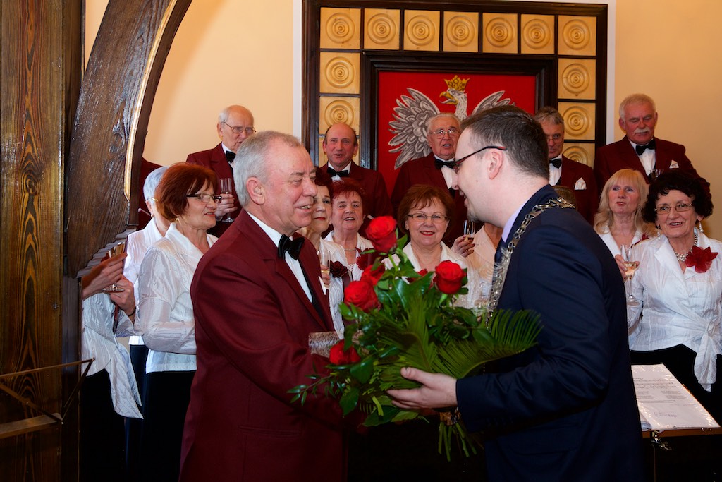 Były też serdeczne życzenia od najbliższych, przyjaciół i zgromadzonych artystów. Nie zabrakło kwiatów, gratulacji oraz symbolicznej lampki szampana. Natomiast w pięknej oprawie artystycznej wystąpił chór ,,Melodia” pod kierunkiem Bogdana Komorowskiego oraz akordeoniści: Jakub Kowalski i Julian Dumicz z Państwowej Szkoły Muzycznej I stopnia w Myśliborzu.