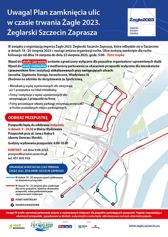 Zamknięte dla ruchu (do godz. 5 w poniedziałek 21 sierpnia) zostaną: ul. Władysława IV od ul. Świętego Floriana do ul. Spichrzowej (wjazd wyłącznie dla pojazdów z przepustkami), ul. Celna (wjazd wyłącznie z przepustkami), ul. Zbożowa (na odcinku do ul. Spichrzowej możliwy będzie jedynie wjazd z przepustkami), ul. Zygmunta Starego, od ul. Jarowita do ul. Wały Chrobrego (na odcinku od ul. Jarowita do ul. Henryka Pobożnego możliwy będzie ruch pojazdów z przepustkami, a na odcinku od ul. Starzyńskiego do ul. Henryka Pobożnego wprowadzony zostanie ruch jednokierunkowy), ul. Szczerbcowa od ul. Jarowita do ul. Wały Chrobrego (na odcinku od ul. Jarowita do ul. Henryka Pobożnego możliwy będzie ruch pojazdów z przepustkami, na odcinku od ul. Henryka Pobożnego do ul. Starzyńskiego wprowadzony zostanie ruch jednokierunkowy), ul. Henryka Pobożnego od ul. Zygmunta Starego do ul. Szczerbcowej (na odcinku od ul. Wawelskiej do ul. Szczerbcowej wprowadzony zostanie ruch jednokierunkowy). Ograniczenie będzie wprowadzone także na ul. Jarowita, gdzie częściowo możliwy będzie ruch pojazdów z przepustkami, ale na odcinku od ul. Szczerbcowej do ul. Zygmunta Starego nastąpi całkowite zamknięcie. Zamknięte będą również: ul. Małopolska od ul. Jarowita do ul. Komandorskiej, ul. Wawelska od ul. Jarowita do ul. Wały Chrobrego, ul. Wały Chrobrego, ul. Komandorska oraz ul. Admiralska.