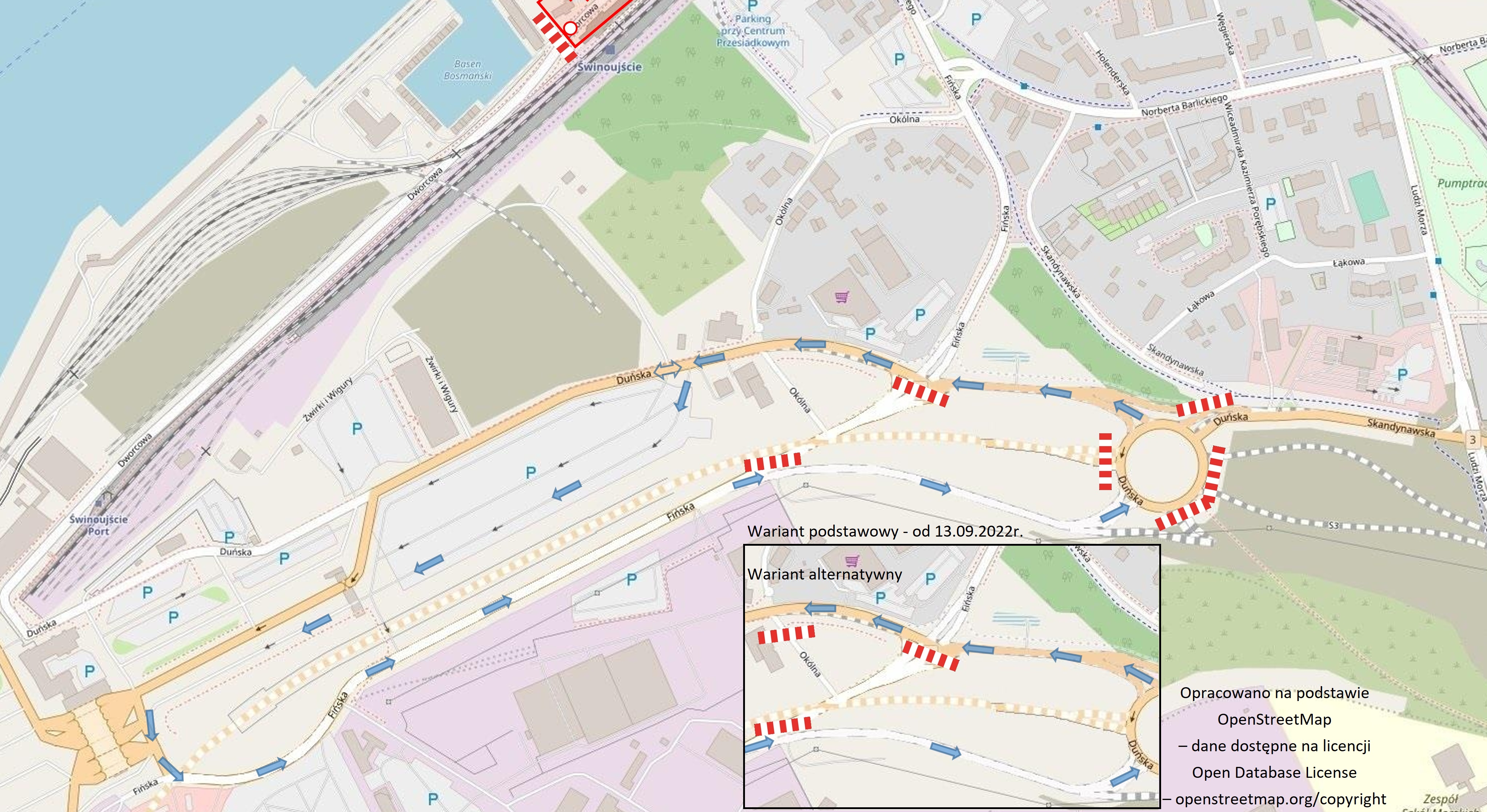 Natomiast do przeprawy promowej „Warszów” dojazd będzie możliwy z ulicy Wolińskiej ulicą Skandynawską, Duńską, Fińską i Barlickiego, natomiast dojazd z tych promów miejskich do ulicy Wolińskiej nadal odbywał się będzie objazdem, który wyznaczony będzie ulicami Barlickiego i Ludzi Morza.