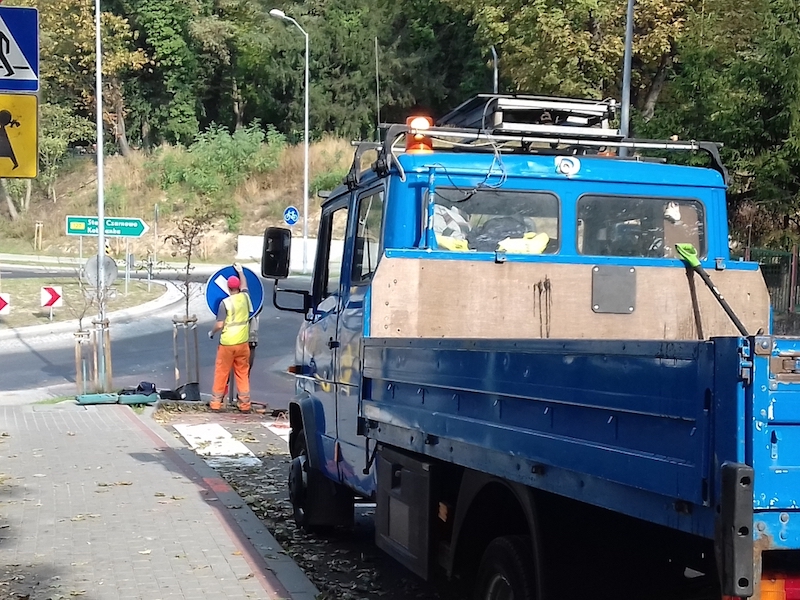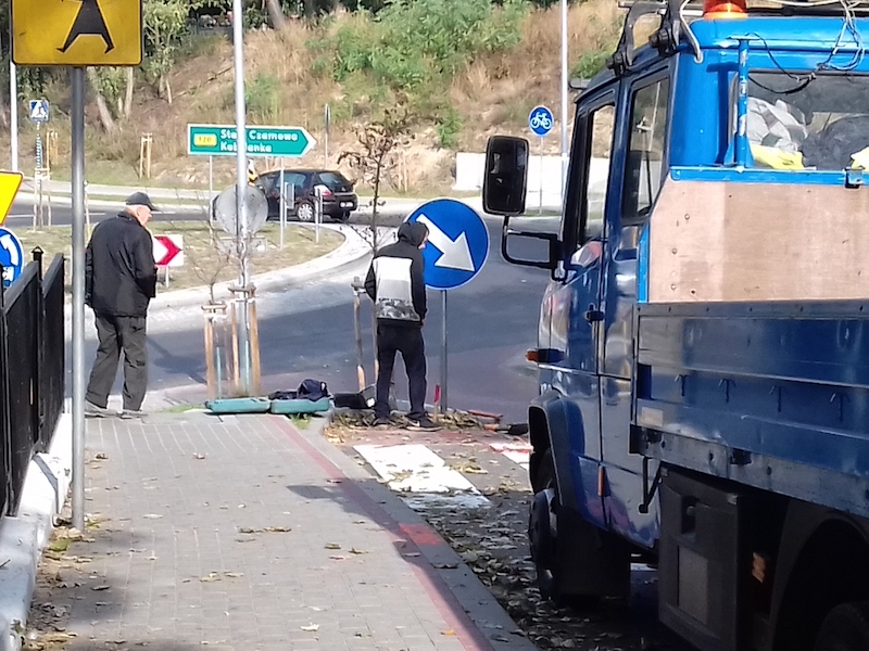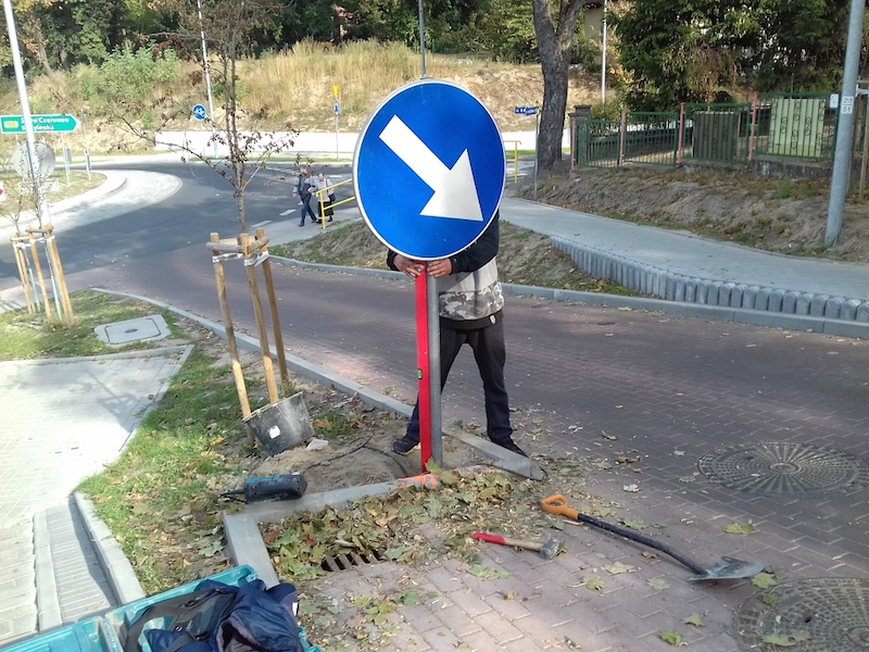 Przechodzący tuż obok gryfinianin ocenił: „nareszcie”; dodał też, że był świadkiem, jak kierowcy wjeżdżali na krawężnik i pobocze, bo nie było żadnej informacji o nagle zmieniającym się pasie ruchu. Z kolei pracownik starostwa nadzorujący montaż znaku przekazał, że są to roboty uzupełniające, gdyż projekty – niedawnego remontu drogi powiatowej oraz budowy ronda – nie przewidywały ustawienia tego nakazu. Odnosząc się zaś do informacji przekazanej przez przechodnia wyjaśnił, że na ulicy 9 Maja obowiązuje ograniczenie prędkości do 40 km/h; stosujący się do tego ograniczenia kierowcy nie przeoczą krawężnika pojawiającego się za przejściem dla pieszych, a powodującego jednocześnie zwężenie jezdni. Ustawiony znak nakazu ma również na celu poprawę bezpieczeństwa przechodniów; ruch pieszych w tej okolicy jest sporu z uwagi na znajdujące się nieopodal dwa przedszkola i szkołę.