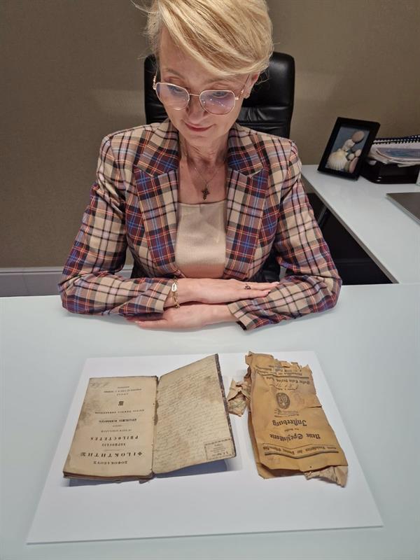 Książka to wydana w Lipsku tragedia Sofoklesa „Filoktet”. Na wewnętrznej stronie okładki znajdują się odręczne zapiski. Mapa w skali 1:100000 przedstawia Insterburg, niemieckie miasto położone na wschód od Królewca, należące obecnie jako Czerniachowsk do Rosji. Oba artefakty (na zdjęciu oglądane przez prezydent Kołobrzegu Annę Mieczkowską) będą eksponowane w kołobrzeskim magistracie. ©℗