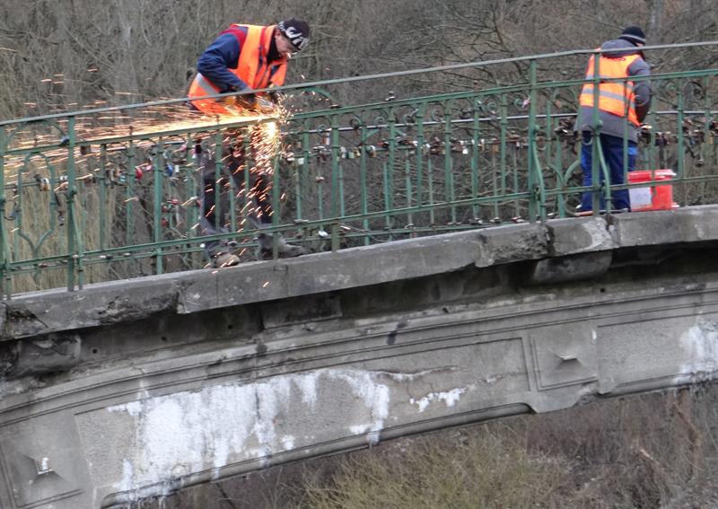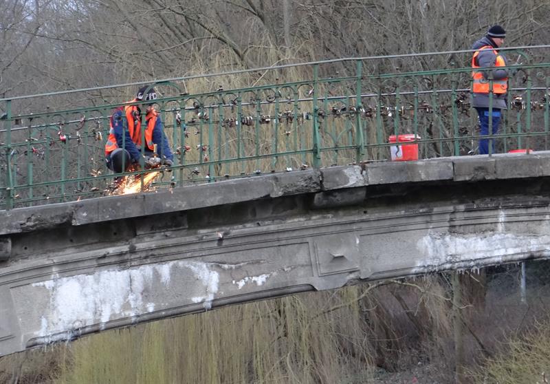 Inwestycja rozpoczęła się - jak widać na zdjęciu - od usuwania kłódek: przez lata, na znak wiecznej miłości, zawieszanych przez zakochane pary na balustradach mostka. „Zdjęte i zabezpieczone, a w przyszłości… wykorzystane w instalacji przeznaczonej do zawieszania pamiątkowych kłódek, która stanie jednak w innym miejscu” - przypomina Centrum Informacji Miasta.
