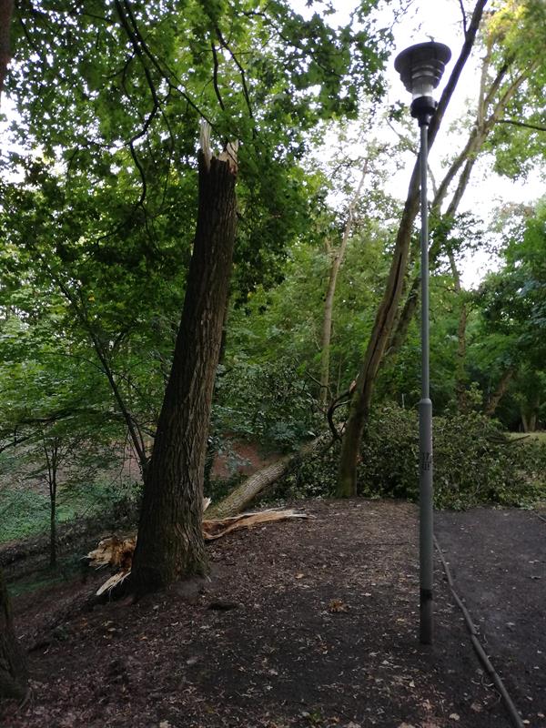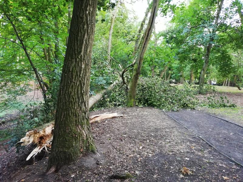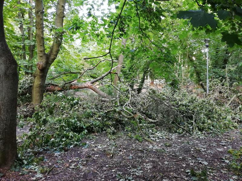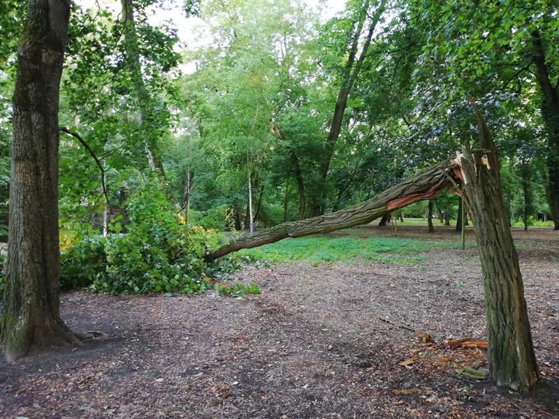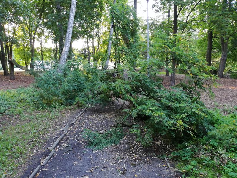 W weekend wiatr połamał drzewa w parku Chopina w Szczecinie. Dwa wieloletnie zdrowe okazy akacji i klonu leżą złamane jak zapałki na wysokości trzech metrów nad ziemią. Zniszczone drzewa znajdują się w centralnym miejscu parku nad wąwozem, którym płynie strumyk Warszewiec. Leżą w odległości kilku metrów od siebie w jednej linii. Czy przyczyną ich runięcia był gwałtowny wiatr, burza, czy trąba powietrzna? Nie wiadomo. Faktem jest, że drzew w parku Chopina z każdym rokiem ubywa. Złamane drzewa czekają teraz na uprzątnięcie przez służby. Warto też, by pozostawione przez nie puste miejsce zostało uzupełnione nowymi nasadzeniami.©℗