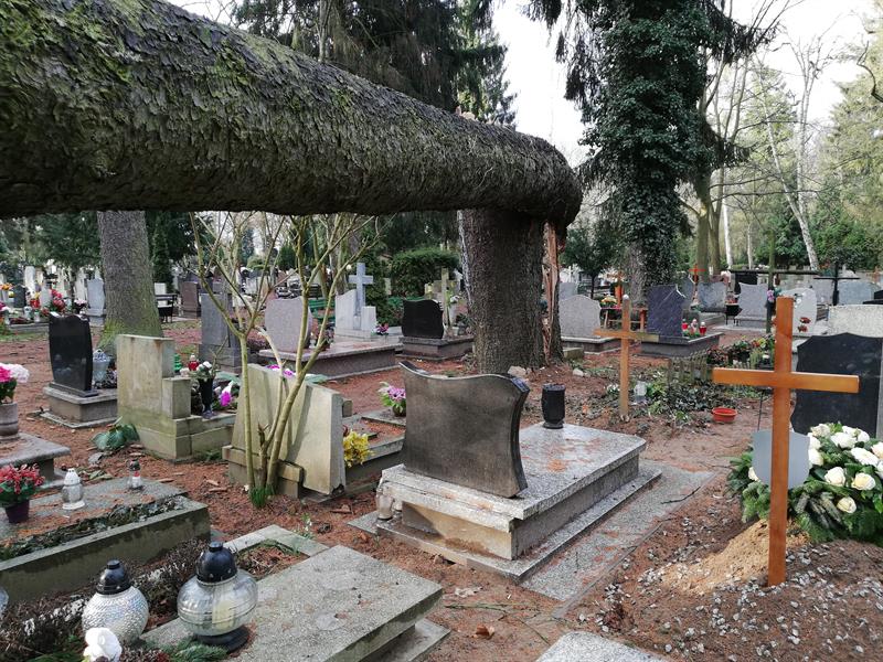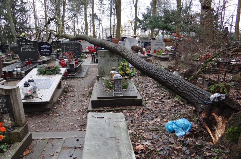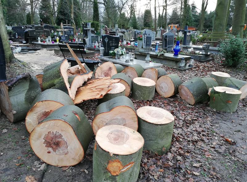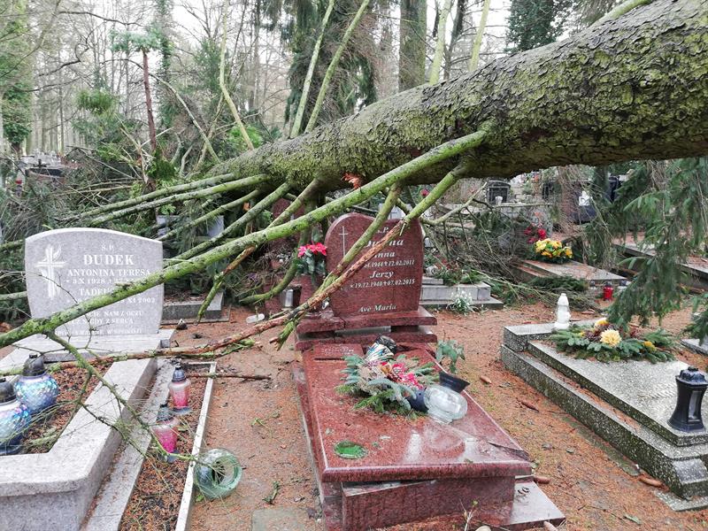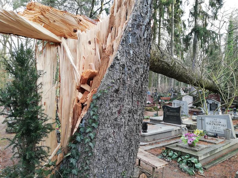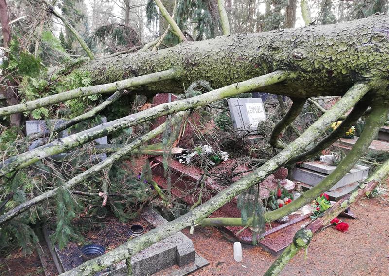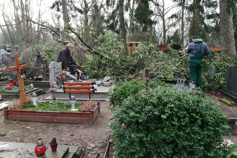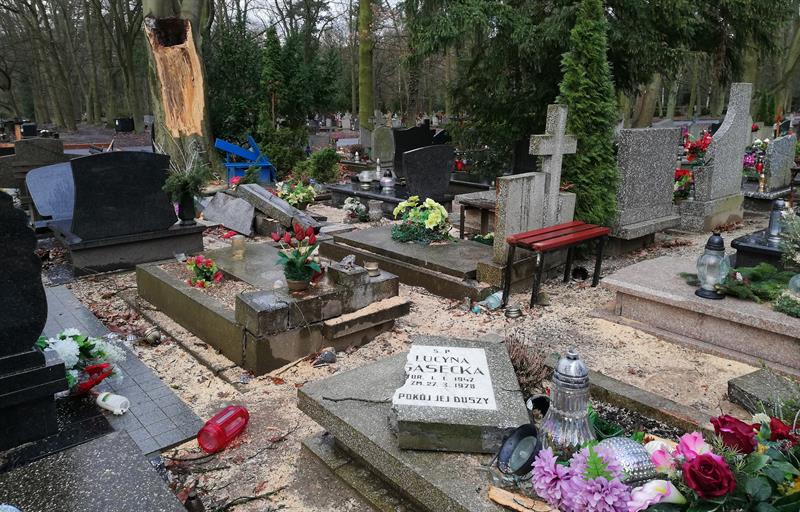 Na szczecińskim Cmentarzu Centralnym trwa usuwanie skutków porywistych podmuchów wiatru z początku tego tygodnia. Żywioł wyrządził dużo szkód. W wielu kwaterach wyrywane z korzeniami drzewa, a w innych te, które połamały się jak zapałki, przy swych potężnych rozmiarach niemal doszczętnie zmiotły z mogił nagrobki. Roztrzaskane na kawałki płyty, cokoły. Obraz zniszczeń poraża i przytłacza. Jak nekropolia długa i szeroka wiatrołomy są systematycznie usuwane z użyciem specjalistycznego sprzętu. Tymczasem meteorolodzy zapowiadają, że koniec tygodnia i początek nadchodzącego weekendu może być również wyjątkowo wietrzny.