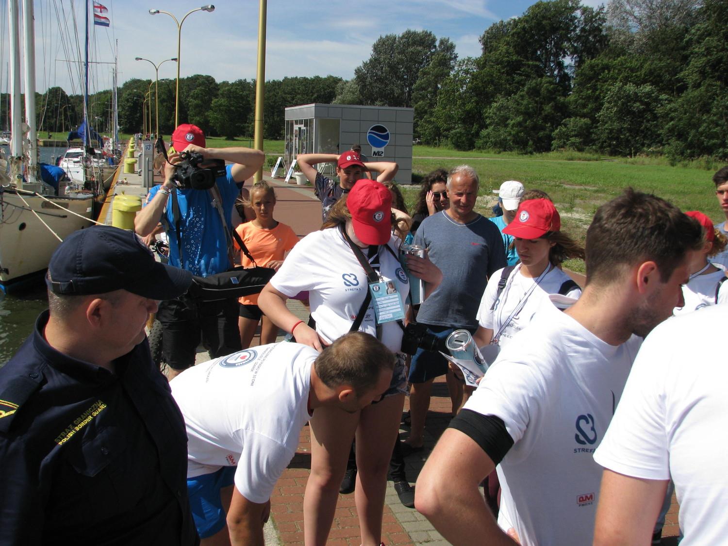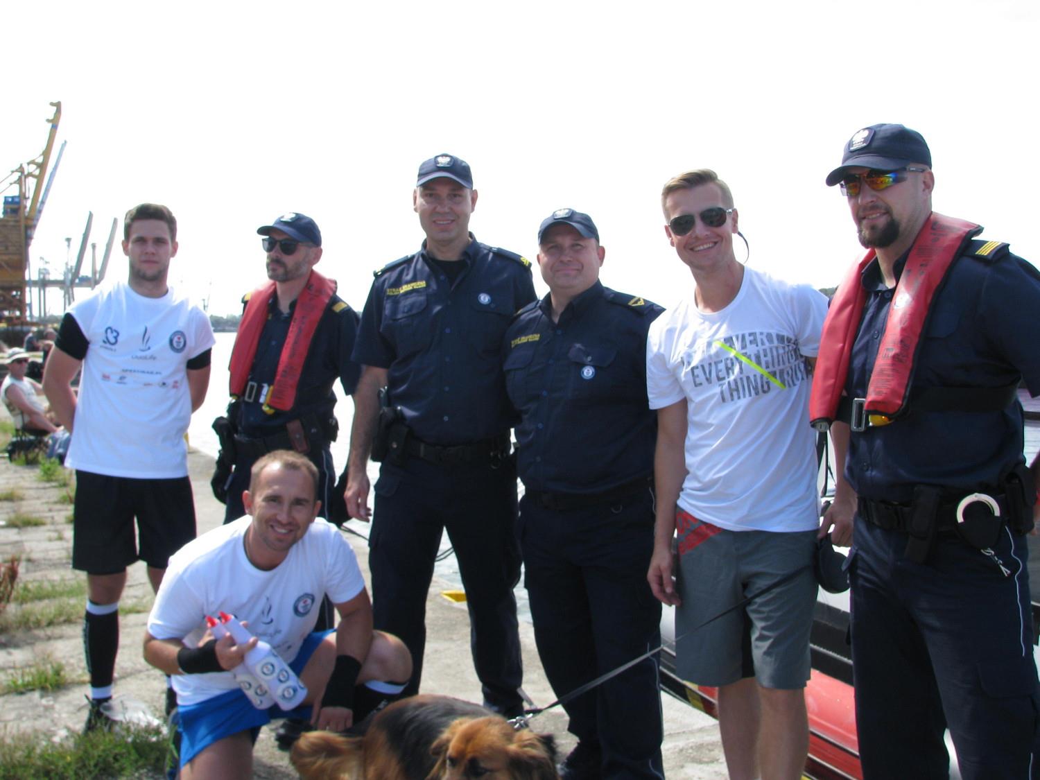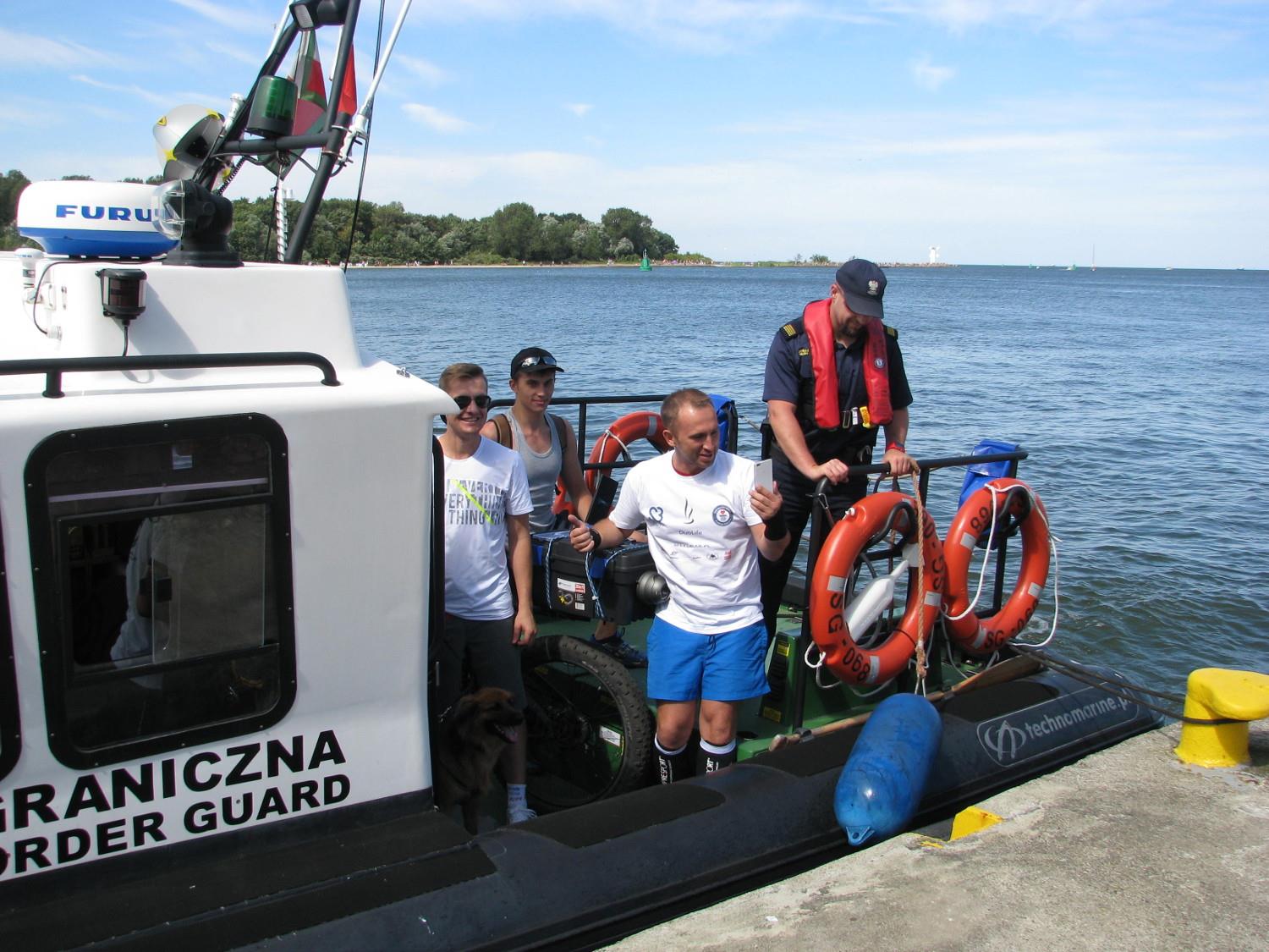 Na zdj.: Po inaugurującym drugi ultramaraton rejsie jednostką pływającą Straży Granicznej żongler Krzysztof Drabik z aktorem Rafałem Mroczkiem rozpoczął we wtorek 8 sierpnia zaplanowany na 10 dni przemarsz wzdłuż 500- kilometrowej linii polskiego Wybrzeża.