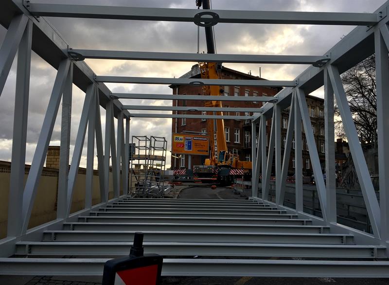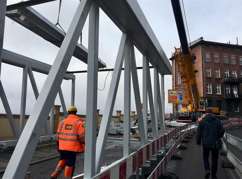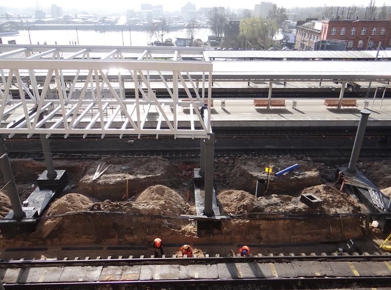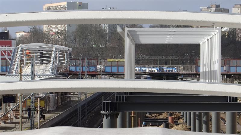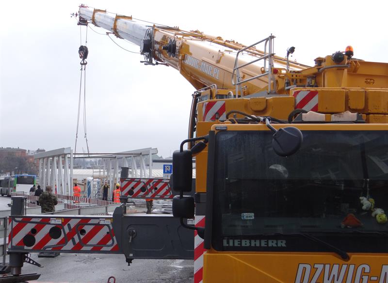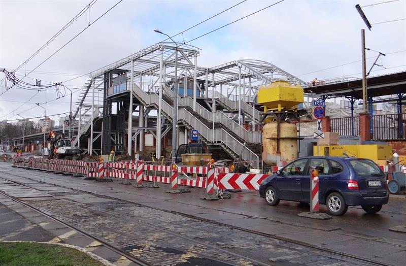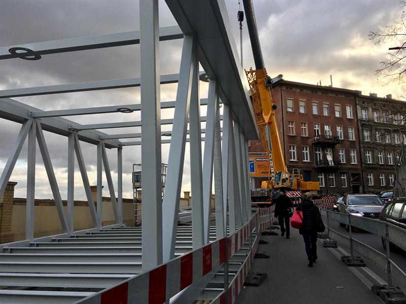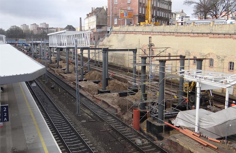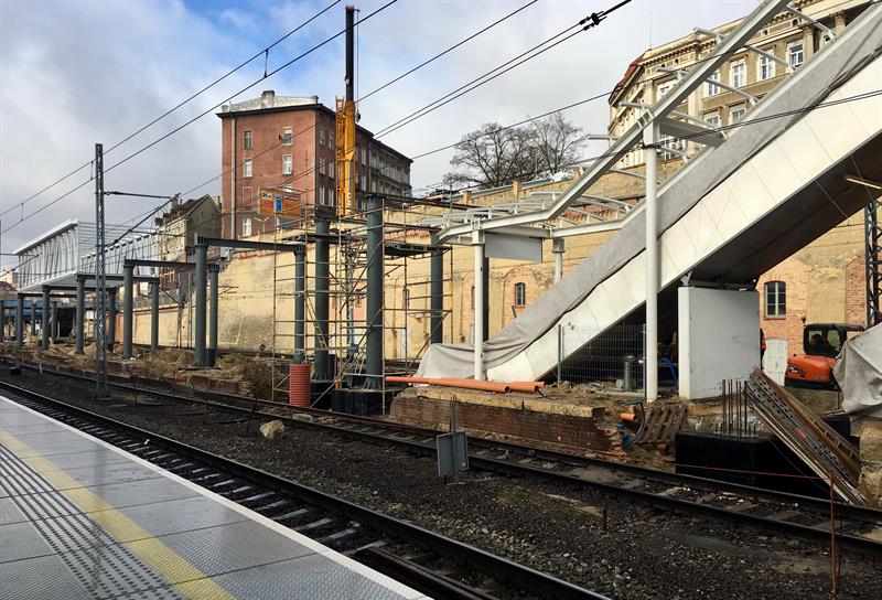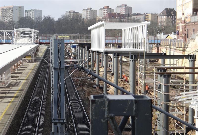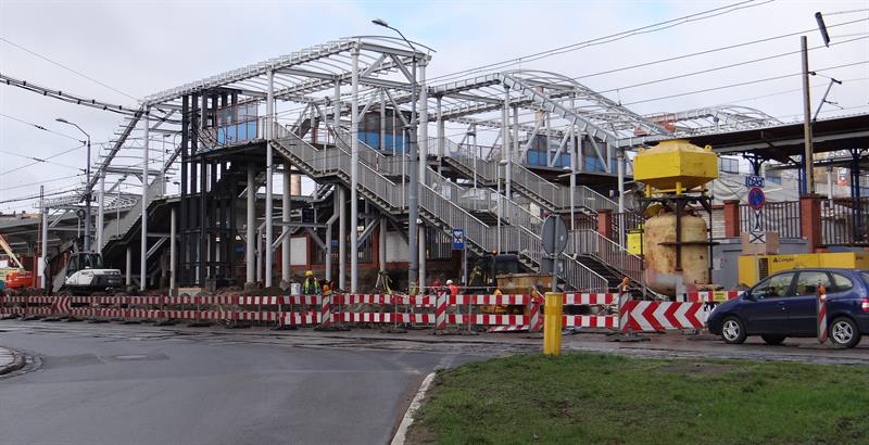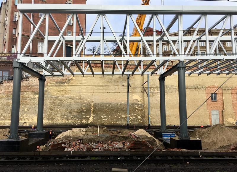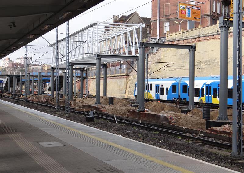 Do minionej środy pierwsze dwa segmenty stalowego szkieletu przejścia nad peronem trzecim osadzone zostały na wzniesionych dotąd wspornikach. W czwartek od rana prowadzone były roboty przy skręcaniu kolejnego z przęseł. Ich montaż i następnie przenoszenie już gotowych elementów konstrukcji na miejsce przeznaczenia odbywa się z wykorzystaniem specjalistycznego żurawia-giganta, ustawionego przy murze od strony ul. Owocowej.