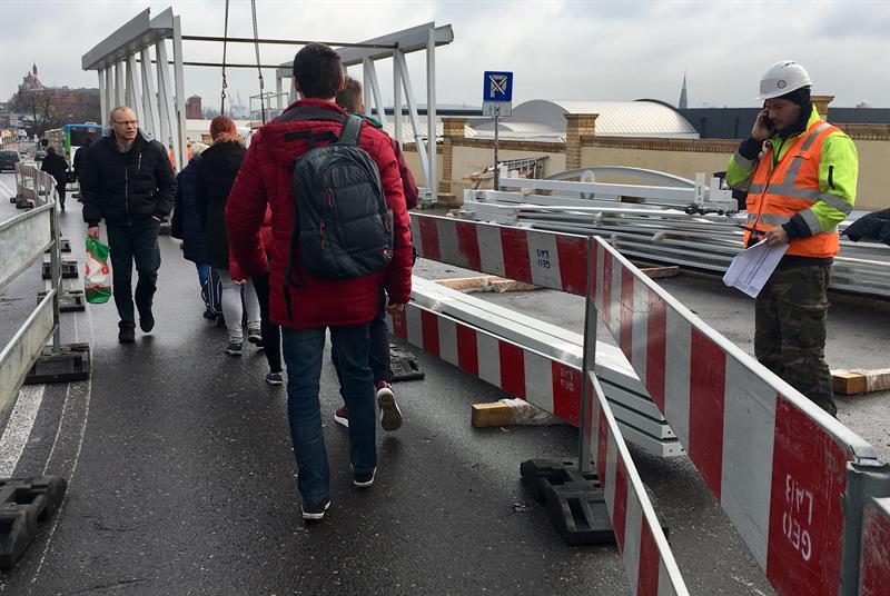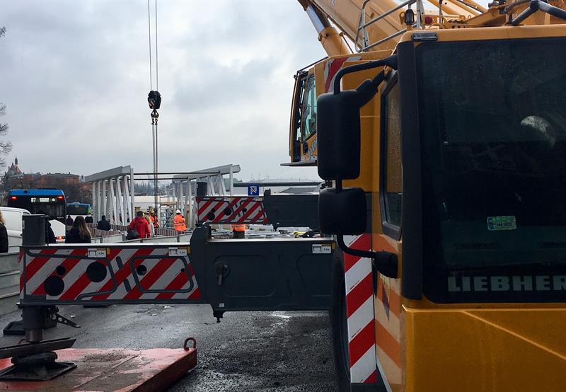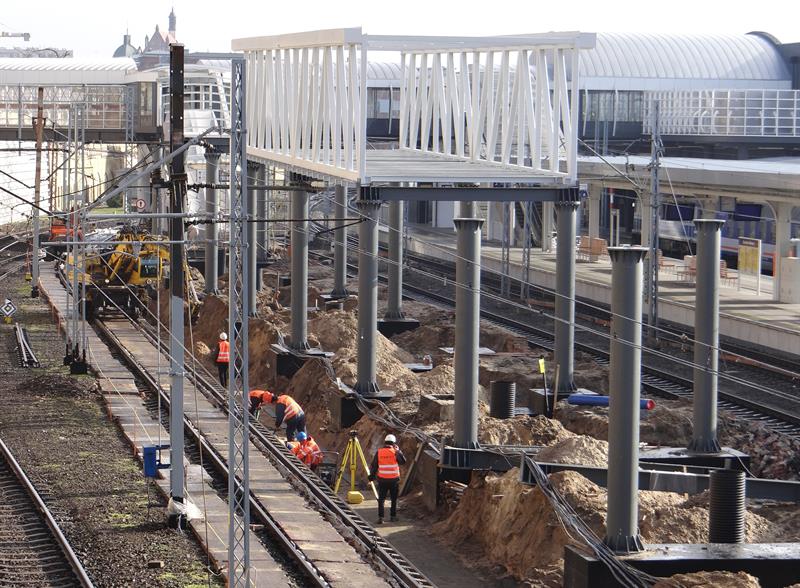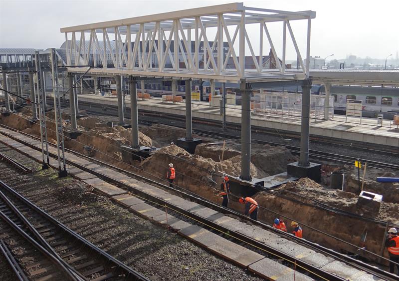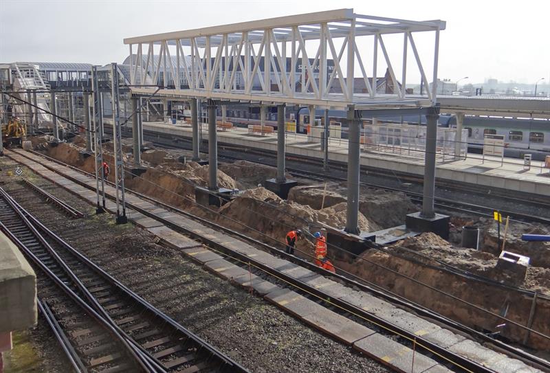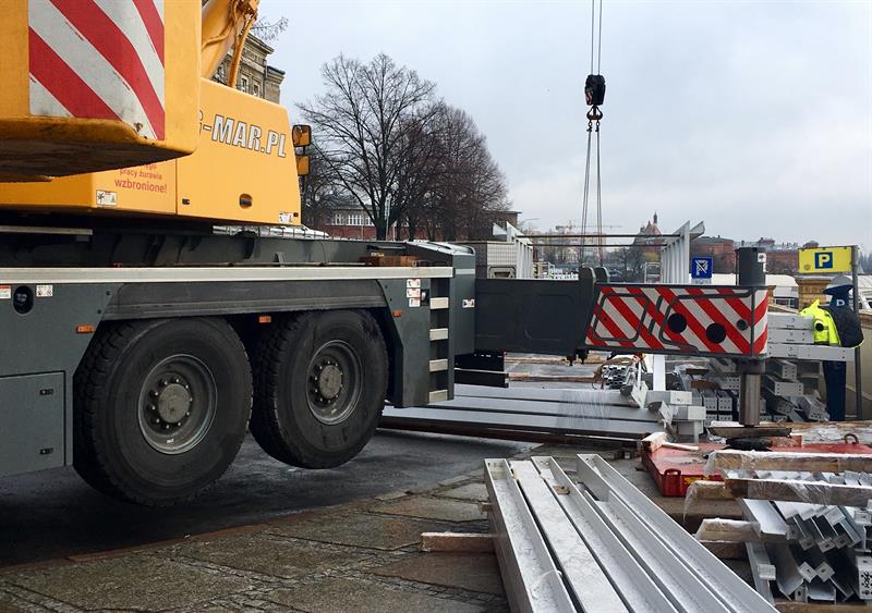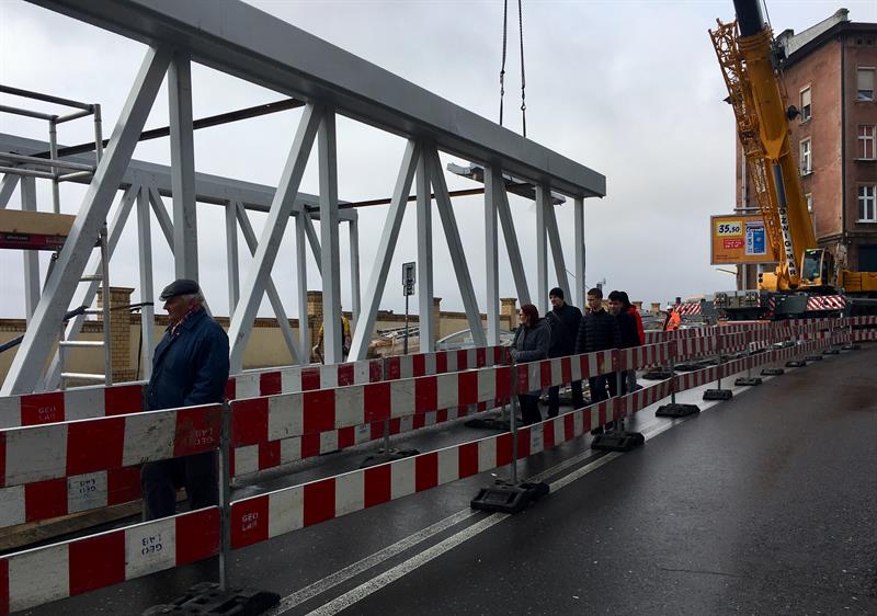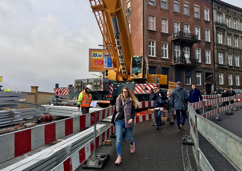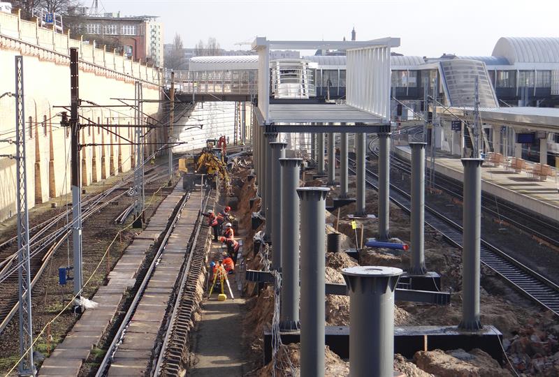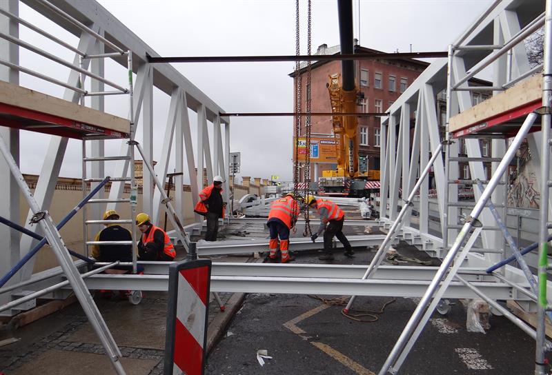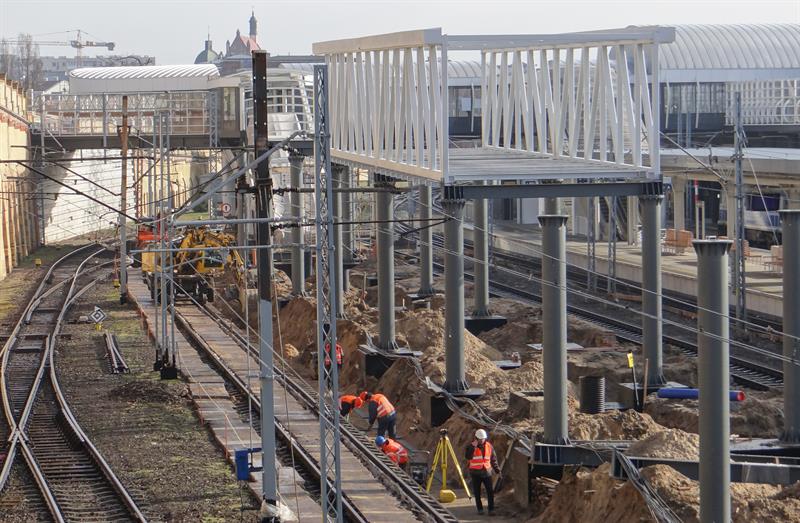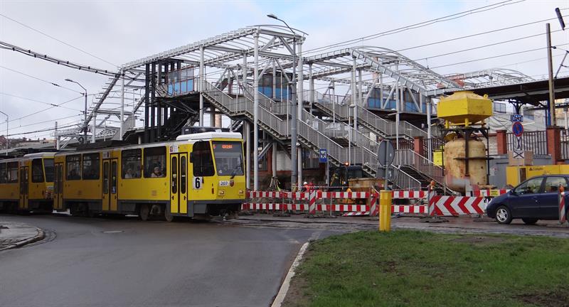 Do minionej środy pierwsze dwa segmenty stalowego szkieletu przejścia nad peronem trzecim osadzone zostały na wzniesionych dotąd wspornikach. W czwartek od rana prowadzone były roboty przy skręcaniu kolejnego z przęseł. Ich montaż i następnie przenoszenie już gotowych elementów konstrukcji na miejsce przeznaczenia odbywa się z wykorzystaniem specjalistycznego żurawia-giganta, ustawionego przy murze od strony ul. Owocowej.