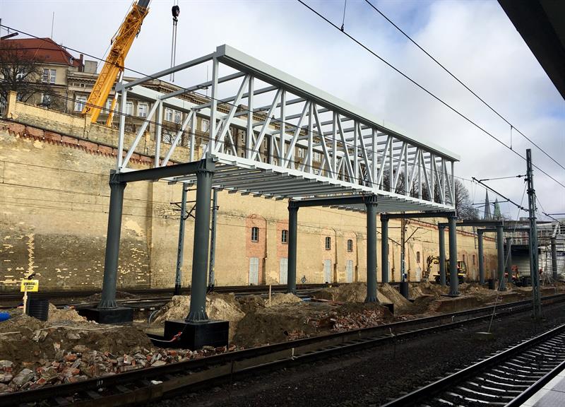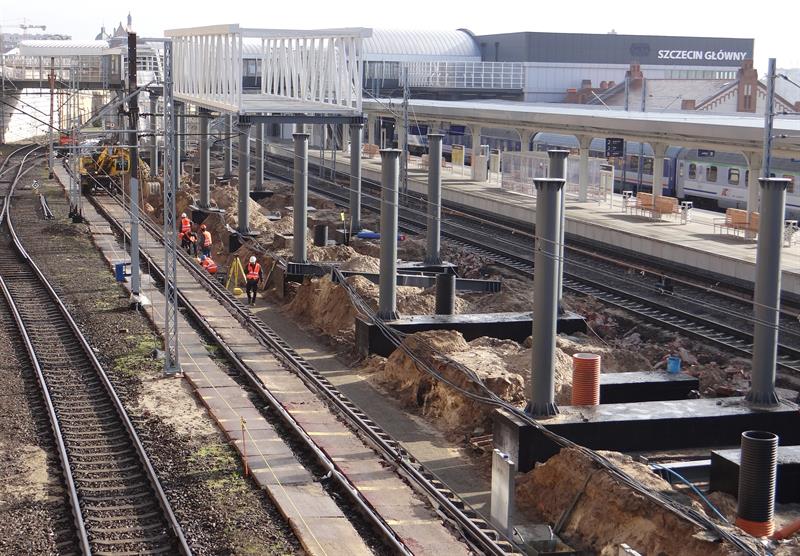 Trwa montaż konstrukcji nowego zadaszenia-łącznika nad przebudowywanym peronem trzecim dworca PKP Szczecin Główny. Zepnie on obecnie modernizowaną starą kładkę wraz z dojściami na pozostałe perony między ulicami Kolumba i Czarnieckiego z nową kładką z hali głównej stacji do ul. Owocowej. To część realizowanego od listopada 2017 roku drugiego etapu modernizacji stacji.