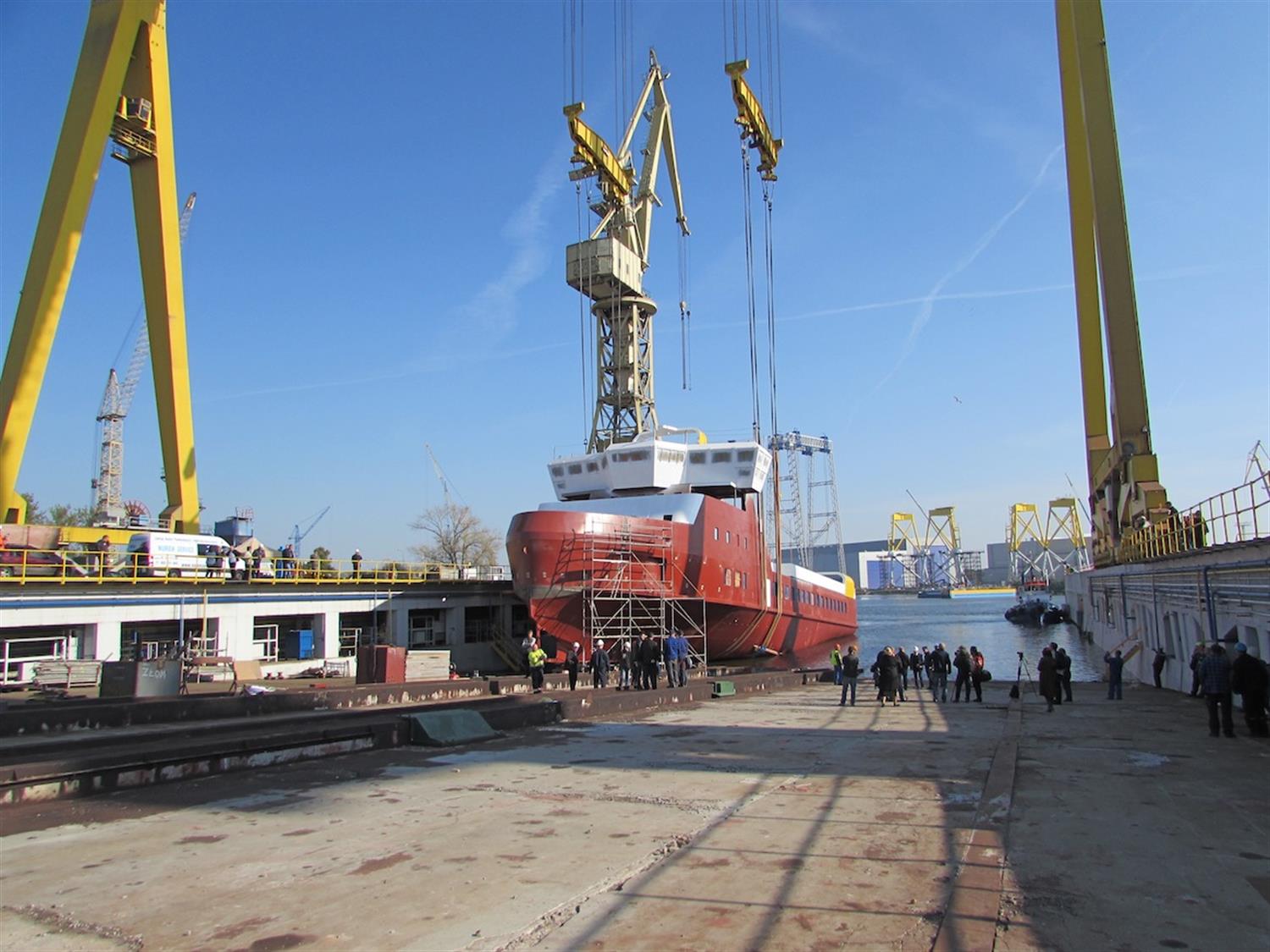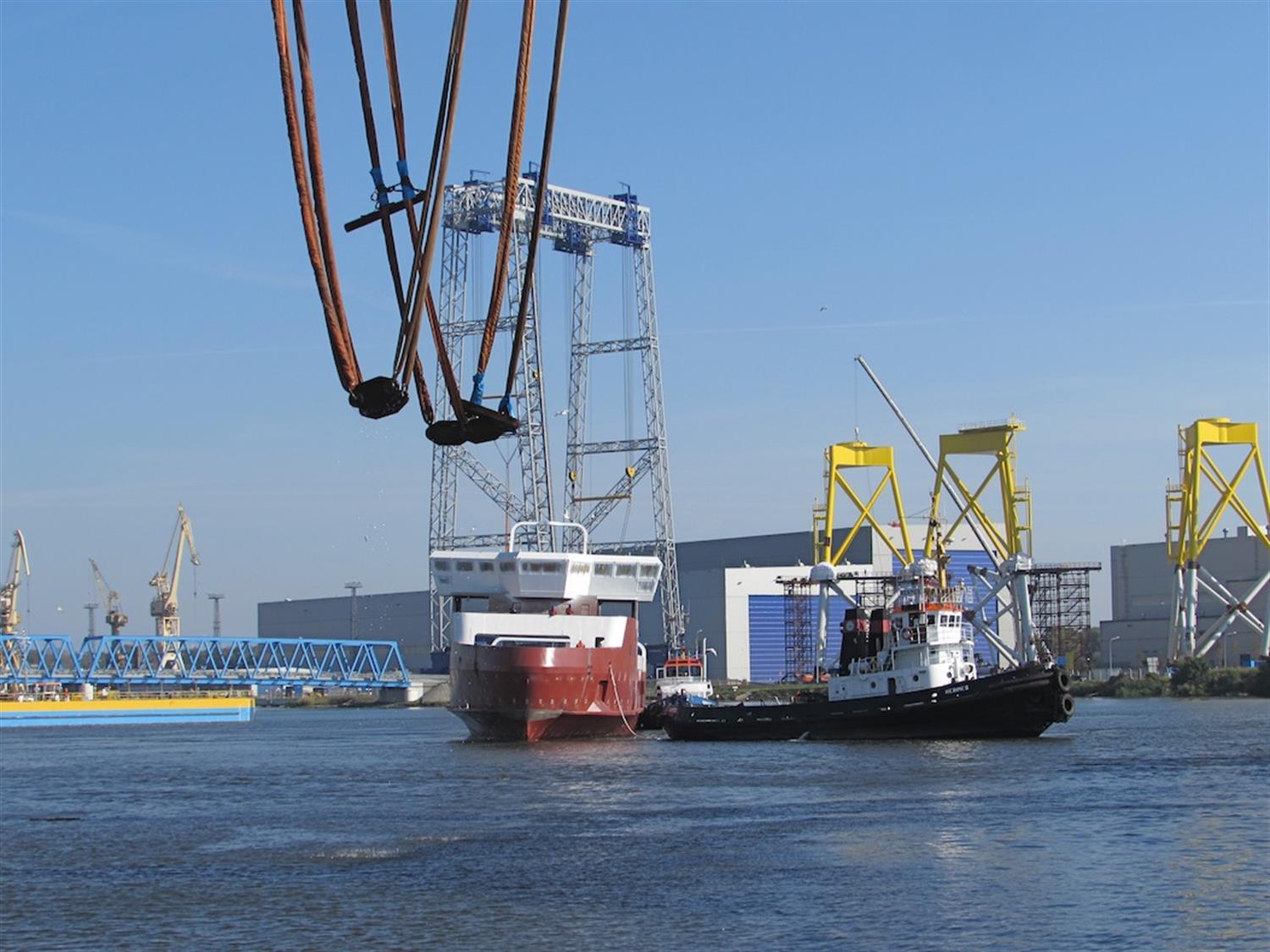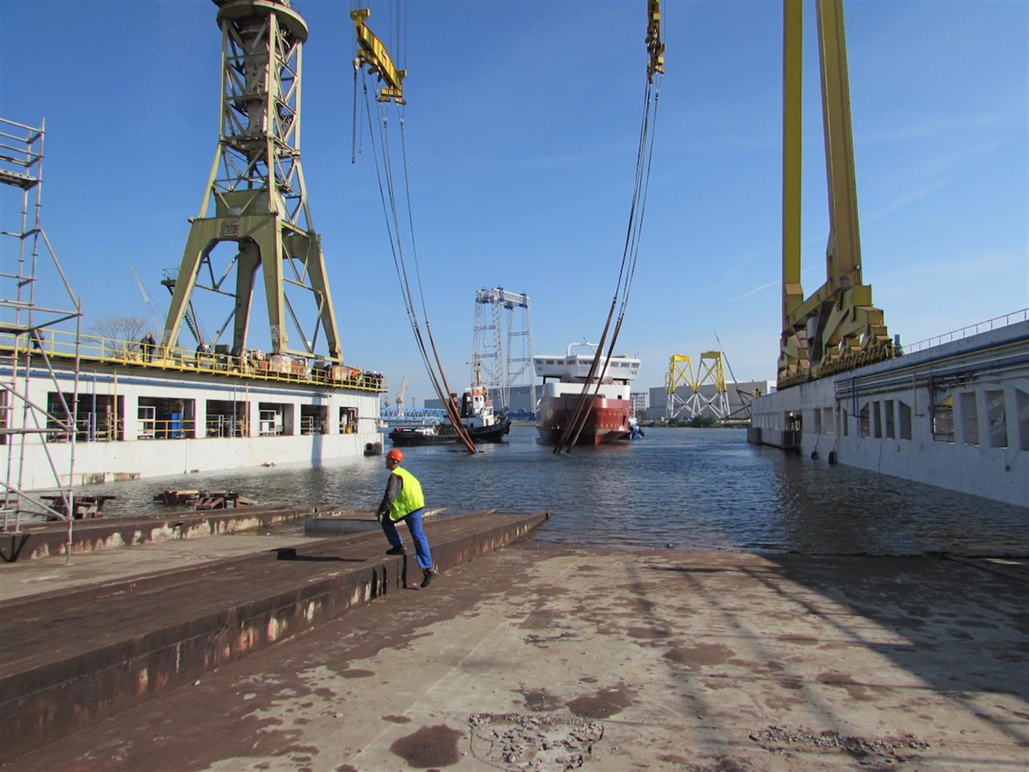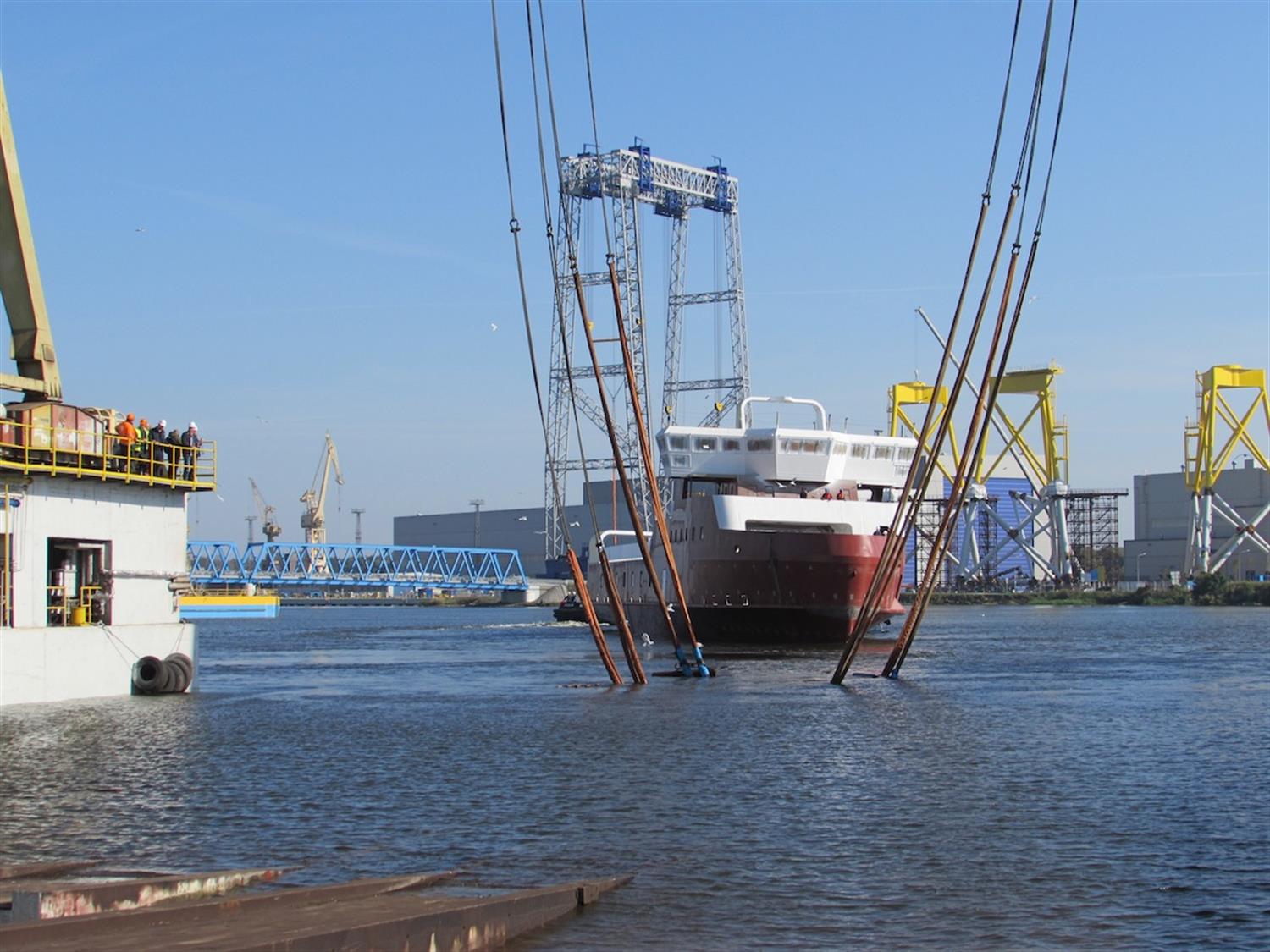 – To już 80. statek zwodowany w stoczni, odkąd tu jestem, czyli przez ostatnie półtora roku – powiedział Andrzej Strzeboński, prezes SPP. – Były paszowce, jednostki techniczne, wielki jacht, a ostatnio przystań promowa. To seria statków, które są budowane i wyposażane, czyli nie tylko czyste kadłuby. Pochylnia żyje. Przy tym wodowaniu zastosowano suwnicę, która może wydać i przyjąć z wody 450 ton. Prom po uwolnieniu bramy zaporowej uzyskał pływalność rufy, został wycofany suwnicą i odholowany do nabrzeża.