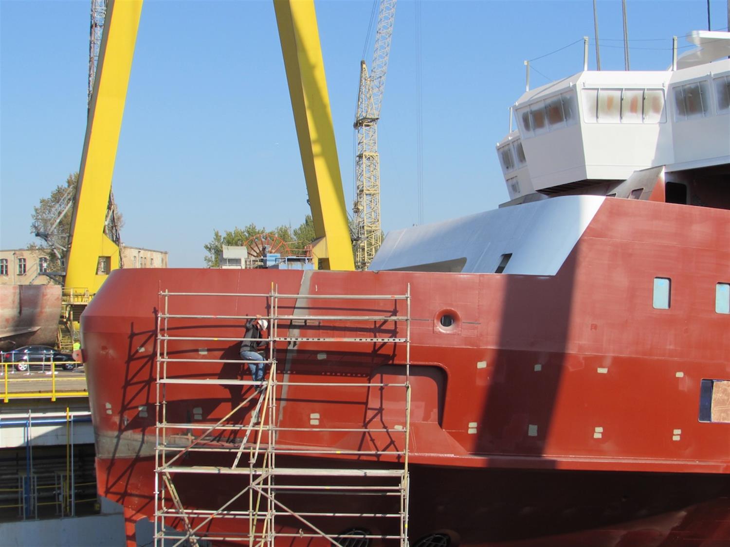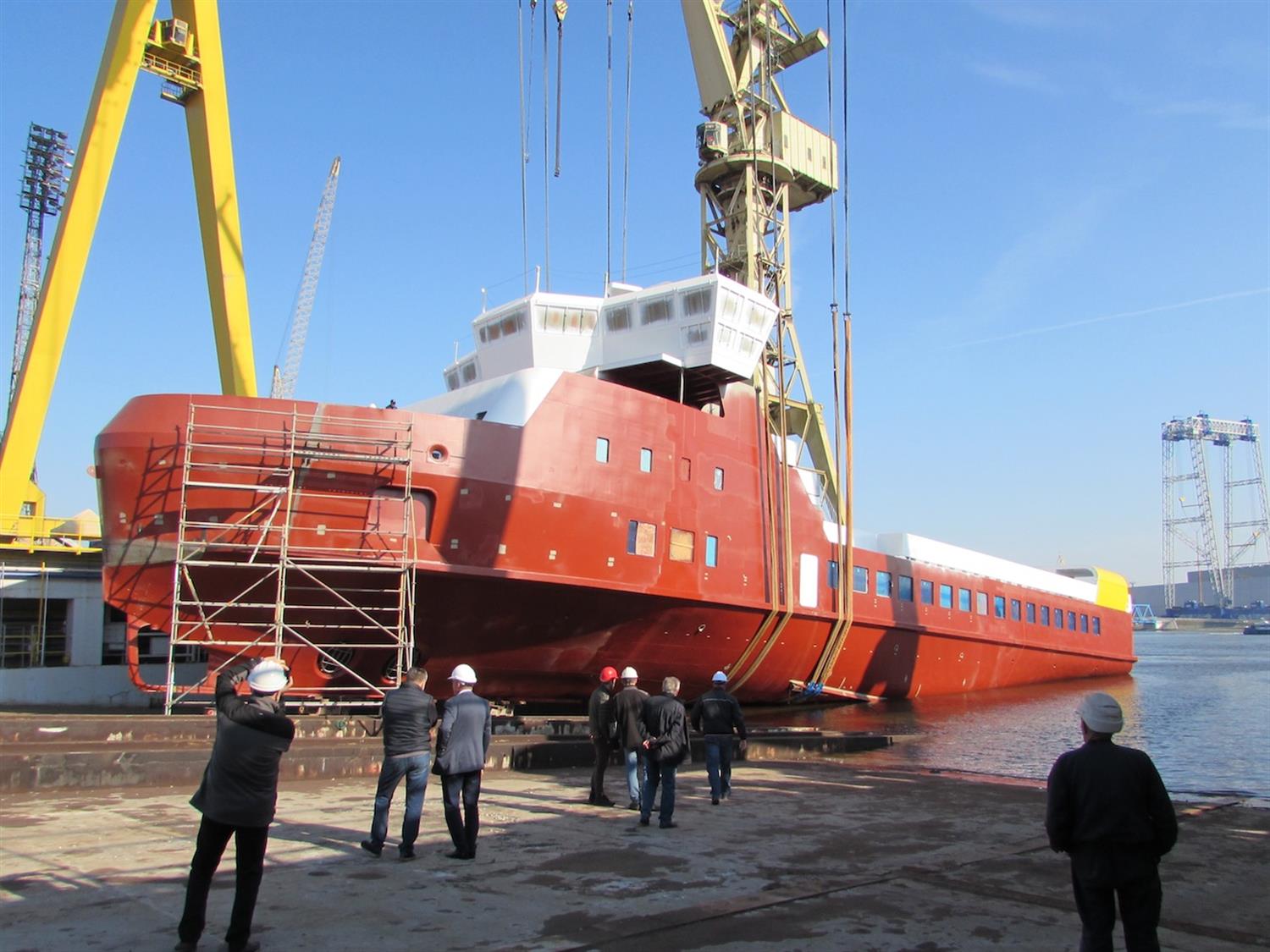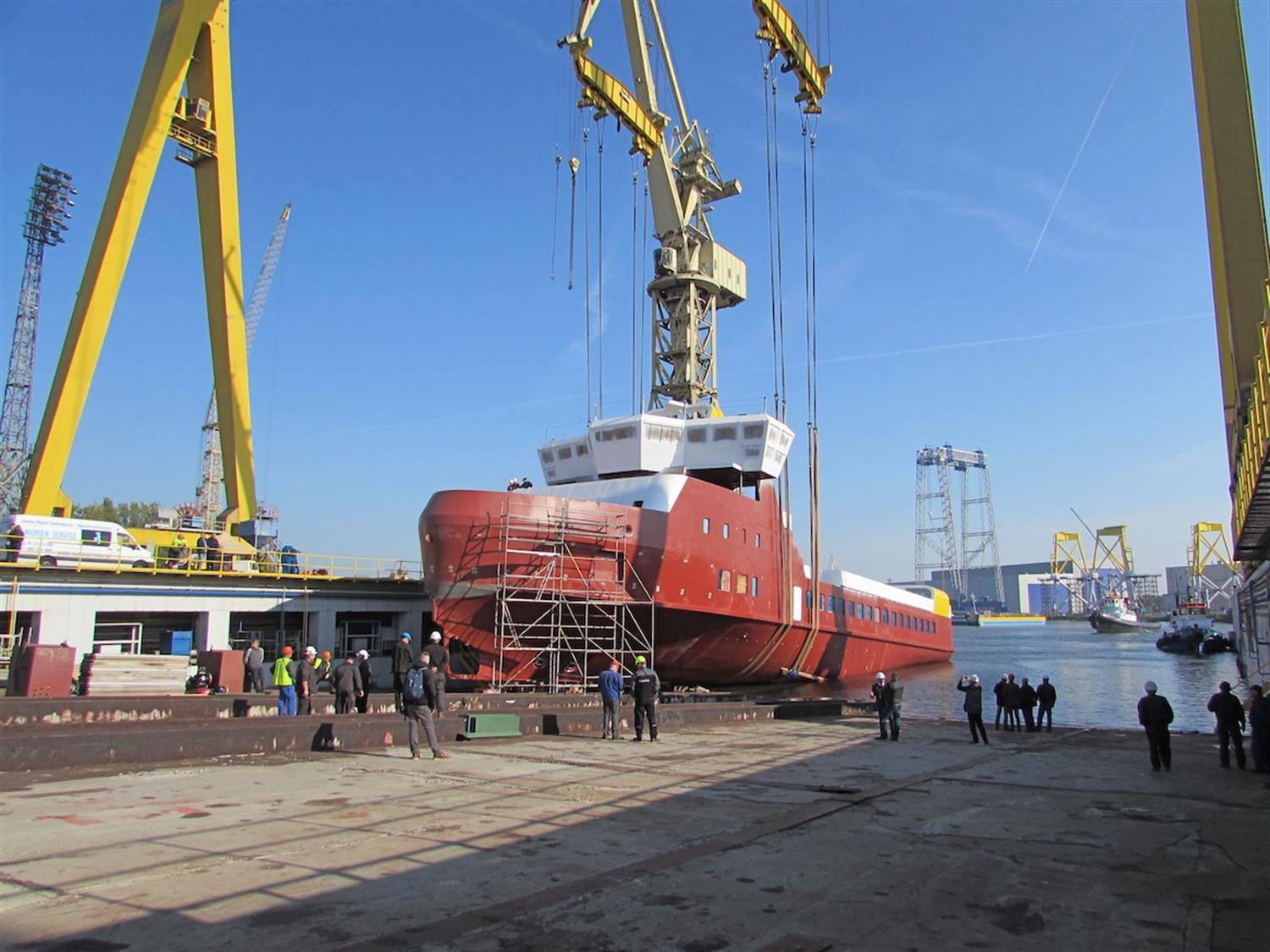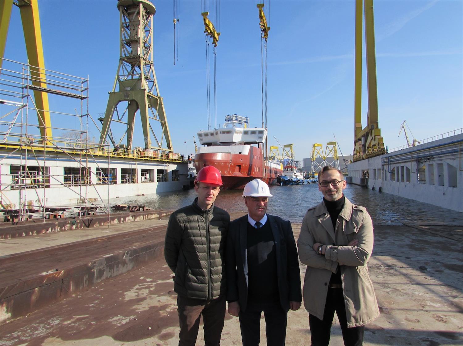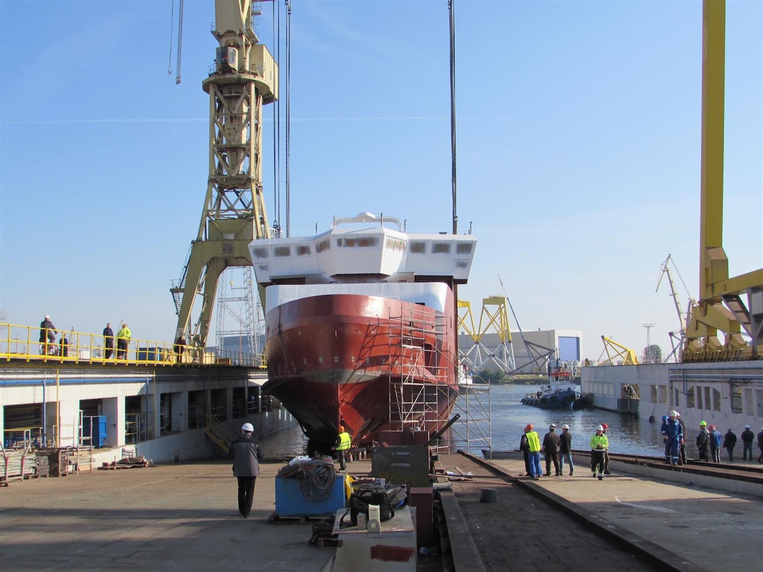 – To już 80. statek zwodowany w stoczni, odkąd tu jestem, czyli przez ostatnie półtora roku – powiedział Andrzej Strzeboński, prezes SPP. – Były paszowce, jednostki techniczne, wielki jacht, a ostatnio przystań promowa. To seria statków, które są budowane i wyposażane, czyli nie tylko czyste kadłuby. Pochylnia żyje. Przy tym wodowaniu zastosowano suwnicę, która może wydać i przyjąć z wody 450 ton. Prom po uwolnieniu bramy zaporowej uzyskał pływalność rufy, został wycofany suwnicą i odholowany do nabrzeża.