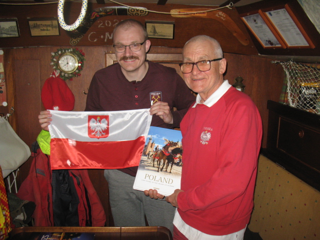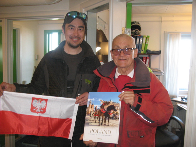 Jak widzimy na zdjęciu, z okazji minionych świąt – Dnia Flagi oraz Konstytucji 3 Maja, żeglarz obdarował miejscowych pamiątkami, polską banderą i albumem o Polsce.