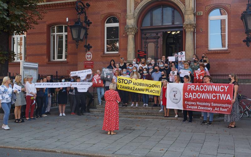 W poniedziałek odbył się protest przed szczecińskim sądem. Widoczni na zdjęciu pracownicy administracyjni Temidy wyszli przed wejście Sądu Okręgowego przy ulicy Kaszubskiej. Przypomnijmy, że 10 sierpnia protestowali pracownicy prokuratur w całym kraju...