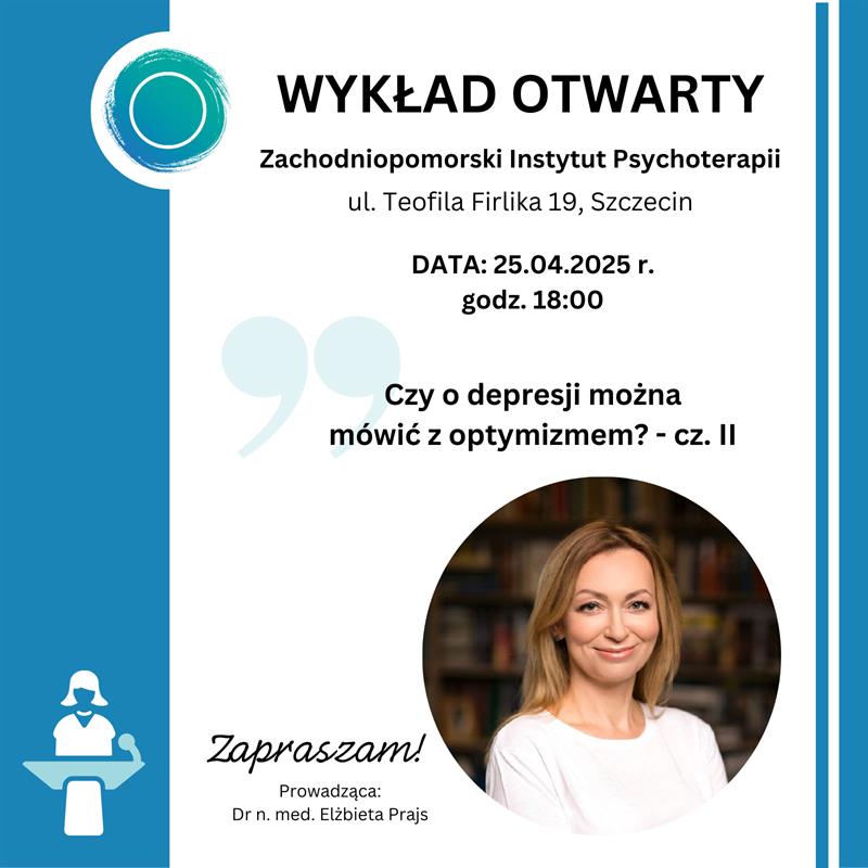 Czy o depresji można mówić z optymizmem? Na to pytanie odpowie dr n. med. Elżbieta Prajs podczas wykładu otwartego w Zachodniopomorskim Instytucie Psychoterapii przy ul. Firlika 19 w Szczecinie. Wykład odbędzie się w piątek 25 kwietnia w sali konferencyjnej...