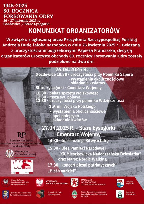 Rocznicowe uroczystości przy Pomniku Sapera w Gozdowicach oraz na Cmentarzu Wojennym w Starych Łysogórkach odbędą się w najbliższą sobotę i niedzielę – 26 i 27 kwietnia. Obchody upamiętnią 80. rocznicę forsowania Odry. Wydarzenie, które planowano na sobotę...