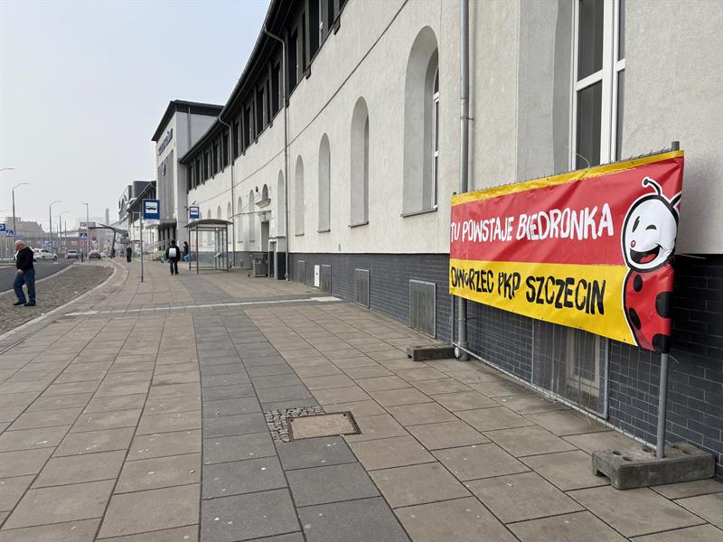 Na dworcu PKP w Szczecinie powstaje dyskont Biedronka. Na budynku przy ul. Kolumba zawisł baner z taką informacją. Pasażerowie przystają przy nim z zainteresowaniem. - Dyskont na dworcu? Jak najbardziej - mówi grupka podróżnych. - Jesteśmy z Poznania...